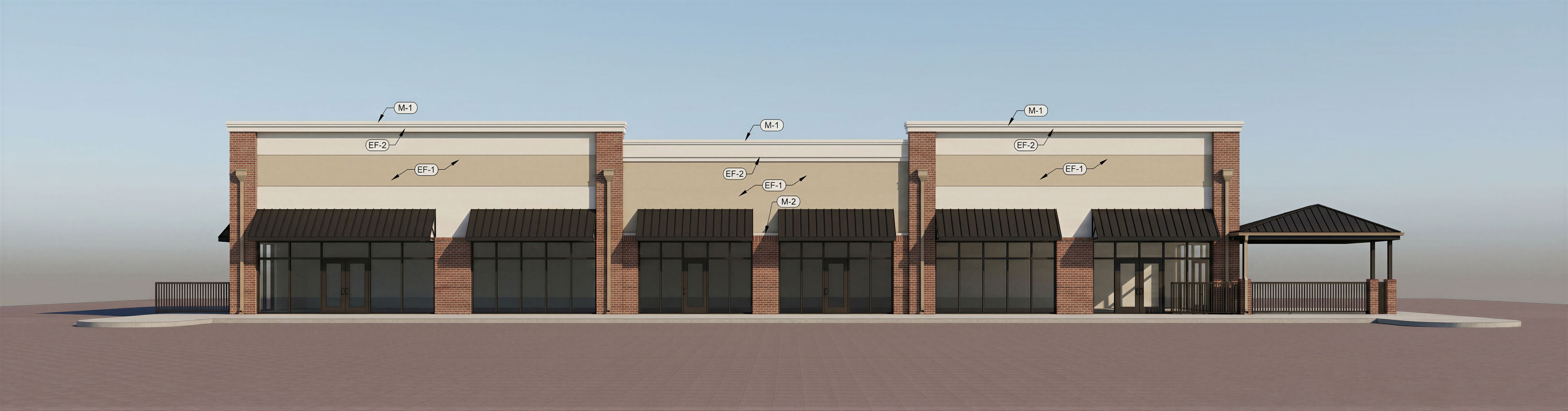 Create a photorealistic 3D exterior rendering based strictly and exclusively on the provided construction drawing building elevation. Do not change, infer, enhance, or reinterpret anything shown in the drawing. Maintain exact scale, proportions, rooflines, parapet heights, door and window locations, mullion spacing, setbacks, and architectural detailing exactly as drawn. Do not modify colors, materials, finishes, textures, or reflectivity in any way. Materials and colors must appear exactly as depicted or noted in the construction elevation, with no substitutions or “real‑world assumptions.” Render the building as a literal three‑dimensional translation of the elevation drawing, preserving all geometry precisely. The output should be realistic and neutral, suitable for professional construction review, permitting, or client presentation—not conceptual or artistic. Exclude all dimensions, scale bars, annotations, callouts, notes, leaders, title blocks, north arrows, or drafting graphics. The colors should be: B-1: General Shale Colony Pointe; B-2: General Shale Spalding Tudor; EF-1: Dryvit SW 6134 Netsuke; EF-2; Dryvit SW 7551 Greek Villa; M-1: Pac-Clad Bone White; M-2: Pac-Clad Matte Black; M-3: Pac-Clad Sierra Tan; P-1: SW 6134 Netsuke; SF-1: YKK Dark Bronze, keep exact camera angle