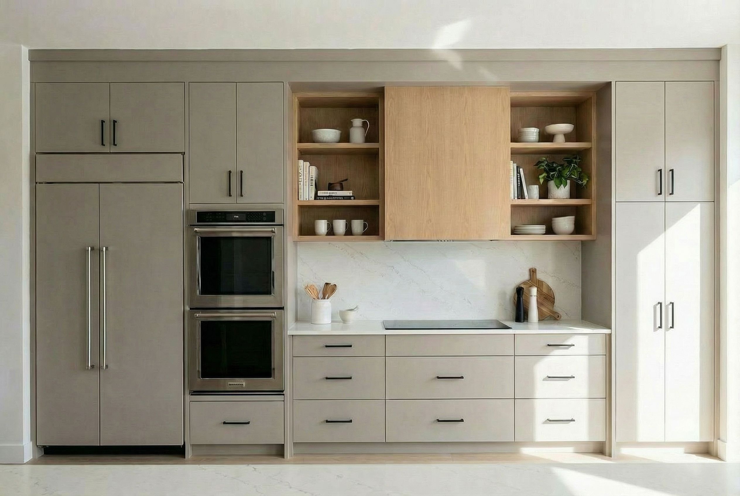 Promptarchitectural exterior rendering, render this 3D mass into photorealistic rendering, add simple black pulls to all drawers and doors , keep exact camera angle, high quality, professional, detailed scene