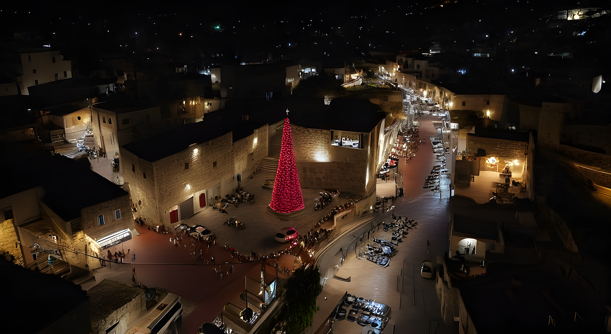 old city of ibillin in the night, dont change geometry and city lights. Streets paved with ancient nazareth stone small tiles,poeple and families walking in the streets, lightened streets between buildings. Covering buildings with ancient nazareth stone, straight roofs of the buildings. christmas square in the middle with outside amphitheatre seats and stage with basement parking, red small food counters with alot of people along side of the christmas square.