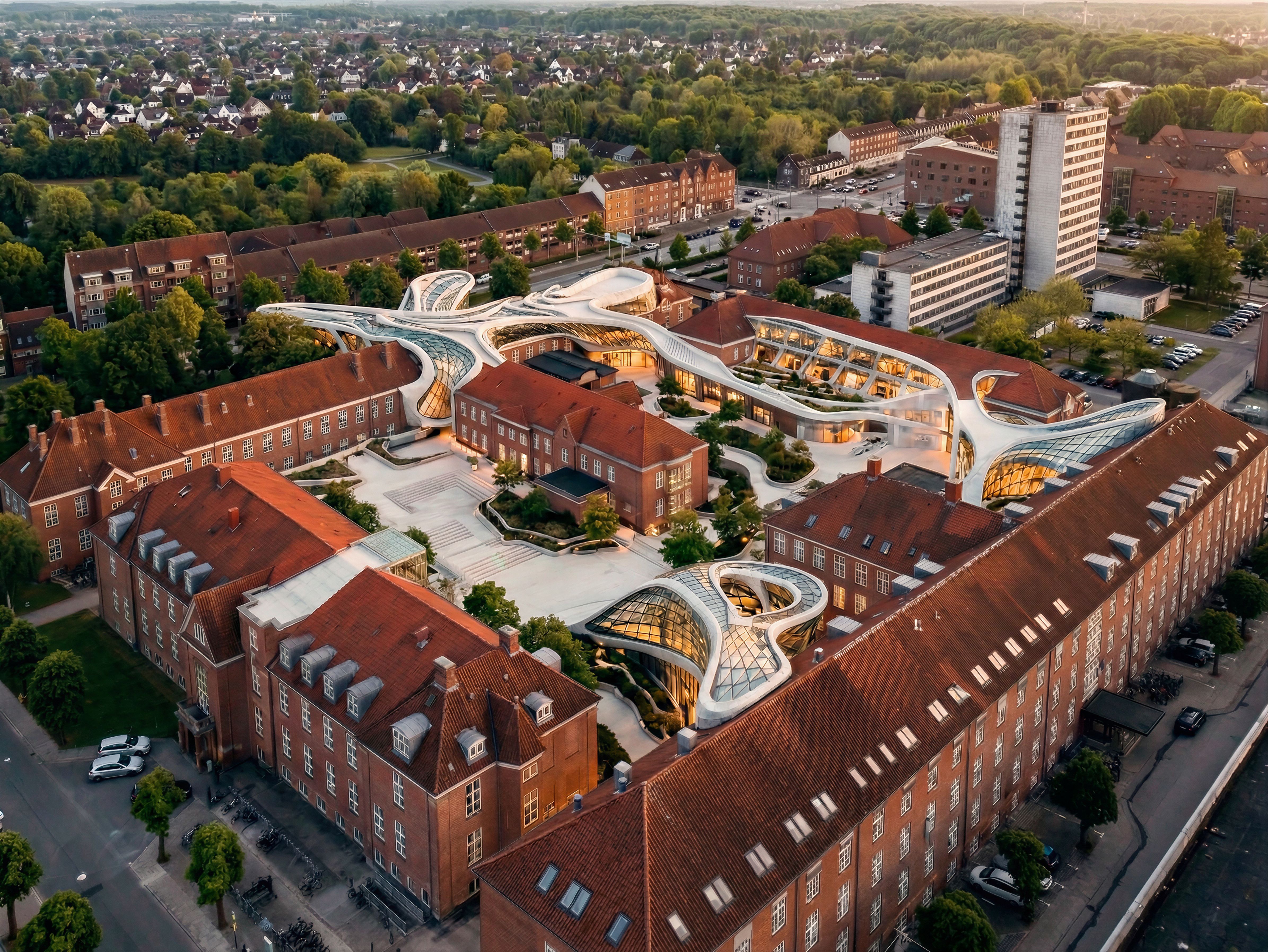 Transform this "base image" and add the structures shown in reference image 1. Make adjustments based on the different perspective viewpoint. The long building on the right side of the "base image" corresponds to the long building at the top of "reference image 1.", keep exact camera angle