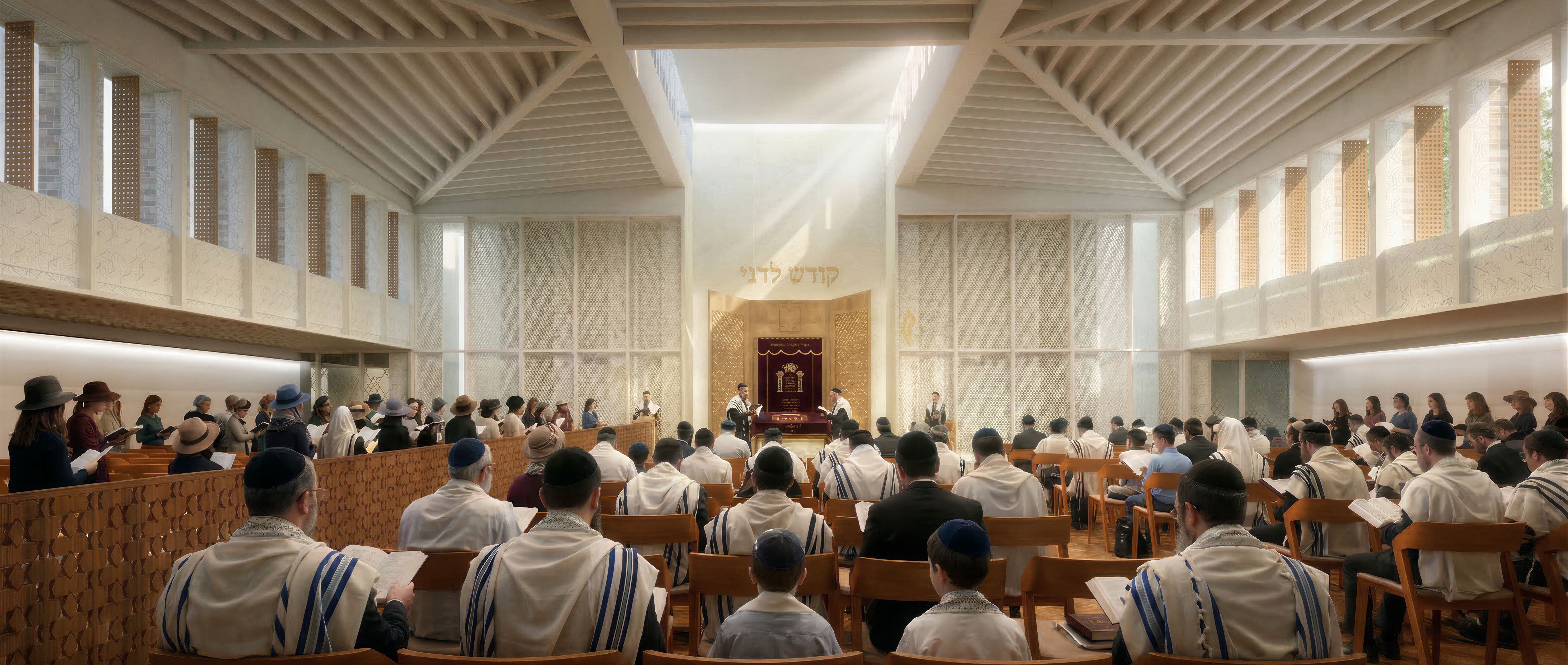 PromptThis is a modern orthodox synagogue. Keep overall daylight appearance, add more men with prayer shawl or kippa and boys to central part of seating., keep exact camera angle