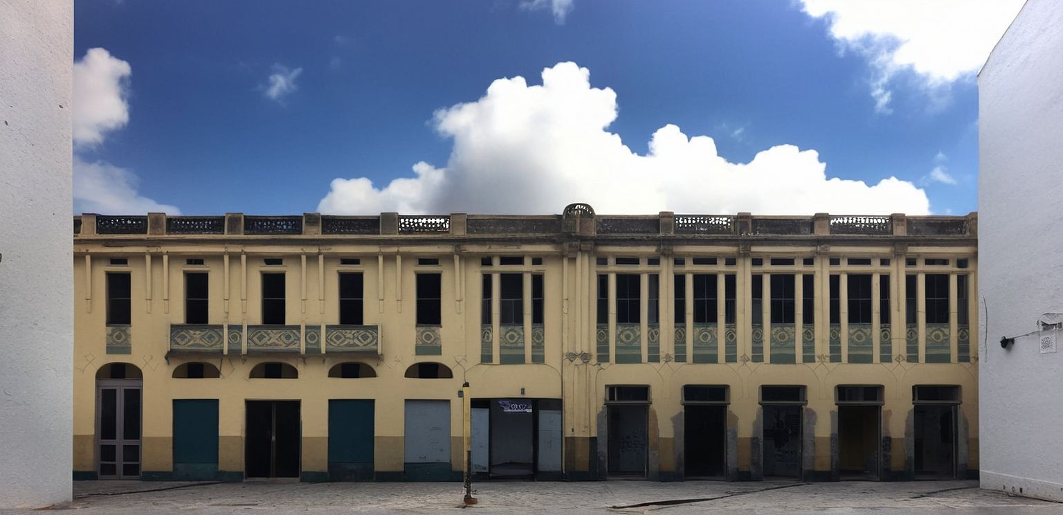 PromptFirst five arcs, counting from left to rights, compose a portal of 3 meter depth with door in the background. The sixth arc is hollow. There is a concrete-made balcony under the second, third and fourth window of the second floor, counting from right to lefst. Same pale yellow color in the entire building. Without any kind of signs, Blue sky wih some clouds. Shadows at 45 degree angle