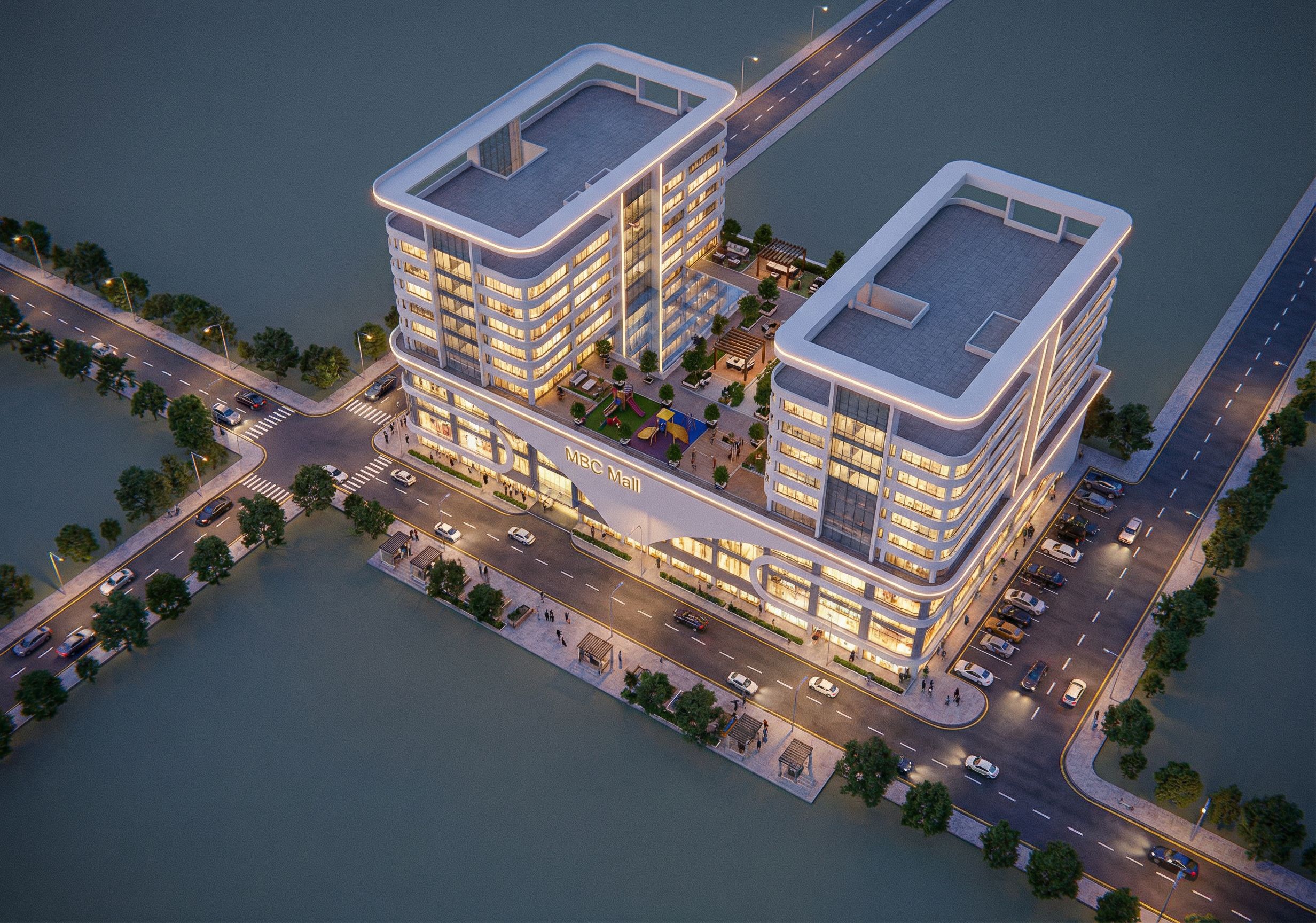 IMAGE SHOWING AN AERIAL VIEW OF A MALL WITH GROUND FLOOR AND FOUR COMMERCIAL FLOORS AND TWO TOWERS FROM 5TH TO 1OTH FLOORS. MAKE THE GLASS CLEAR REFLECTIVE AND REALISTIC. TURN ON THE LIGHTS IN THE BUILDING. INCLUDE ROPE LIGHTS, SPOT LIGHTS AND STREET LIGHTS IN THE BUILDING. USE WHITE WALL MASTER ON THE BUILDING. INCLUDE NAME "MBC MALL" ON THE BUILDING. INCLUDE A CHILDREN'S PLAYING AREA AND SITTING AND RELAXING AREA ON THE ROOF TOP BETWEEN THE TWO TOWERS. Make image realistic and high resolution. Reduce the spot lights.
