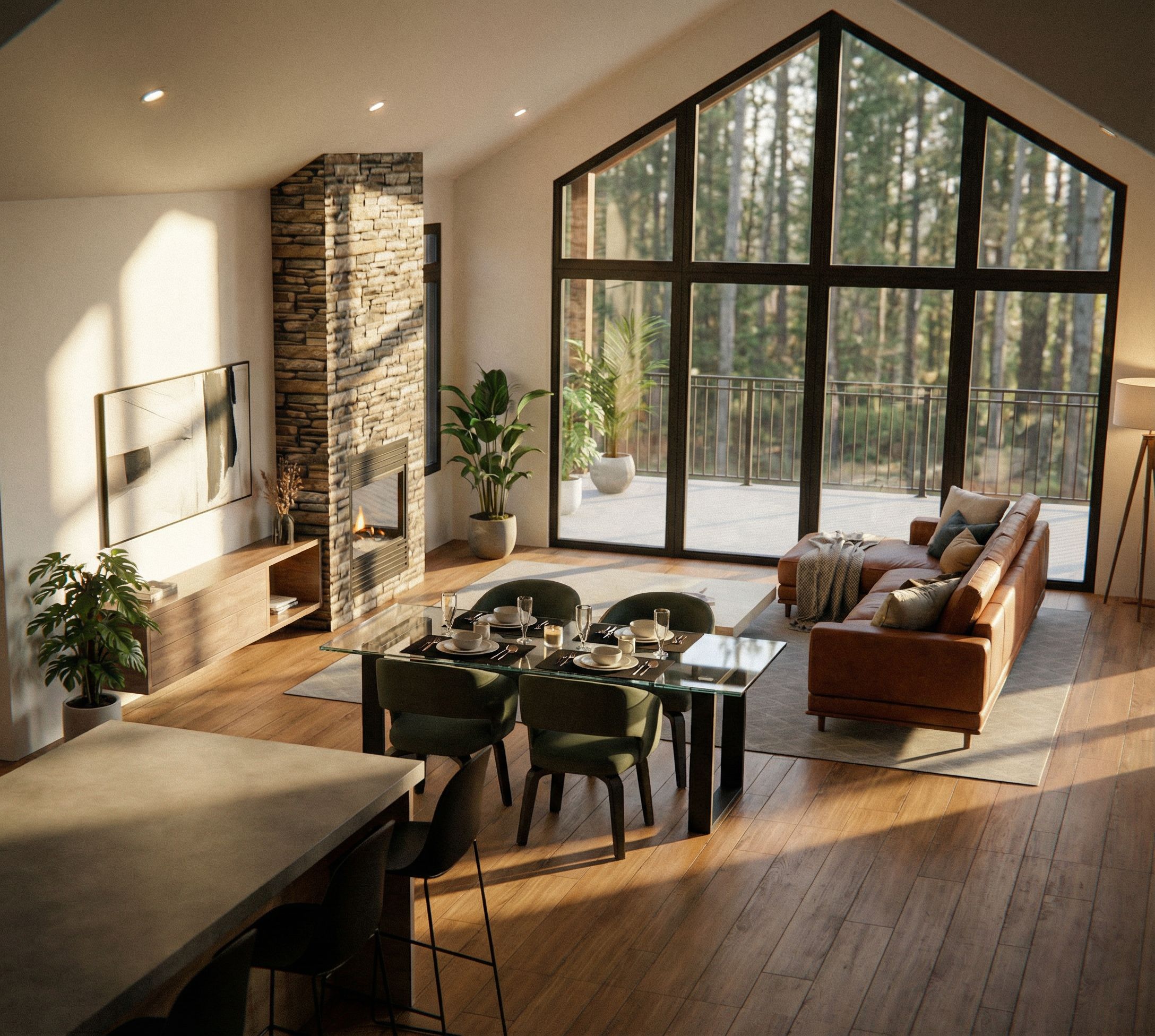 Photo of a modern open-concept living space featuring a cozy yet elegant design. Emphasize the stone fireplace, large floor-to-ceiling windows, and hardwood flooring. Highlight the contrast between the sleek dining table with minimalist tableware and the plush, inviting brown sofa. Set in a serene environment with a view of trees through the windows, capturing natural afternoon light that casts soft shadows across the room. Capture from a slightly elevated angle with a wide lens to incorporate the spacious layout and warm ambiance., keep exact camera angle