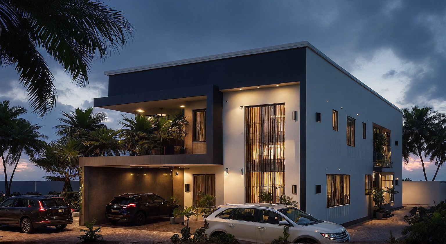 PromptPhoto of a modern residential building featuring a unique facade with a blend of smooth and textured materials. The structure includes large windows framed with sleek metal and a spacious balcony with planters. Surrounded by tropical landscaping, the setting reflects a vibrant urban environment with nearby palm trees. Captured during twilight, warm artificial lighting enhances architectural details while casting soft shadows. The perspective is a low-angle shot with wide lens framing to emphasize the height and modernity of the architecture.