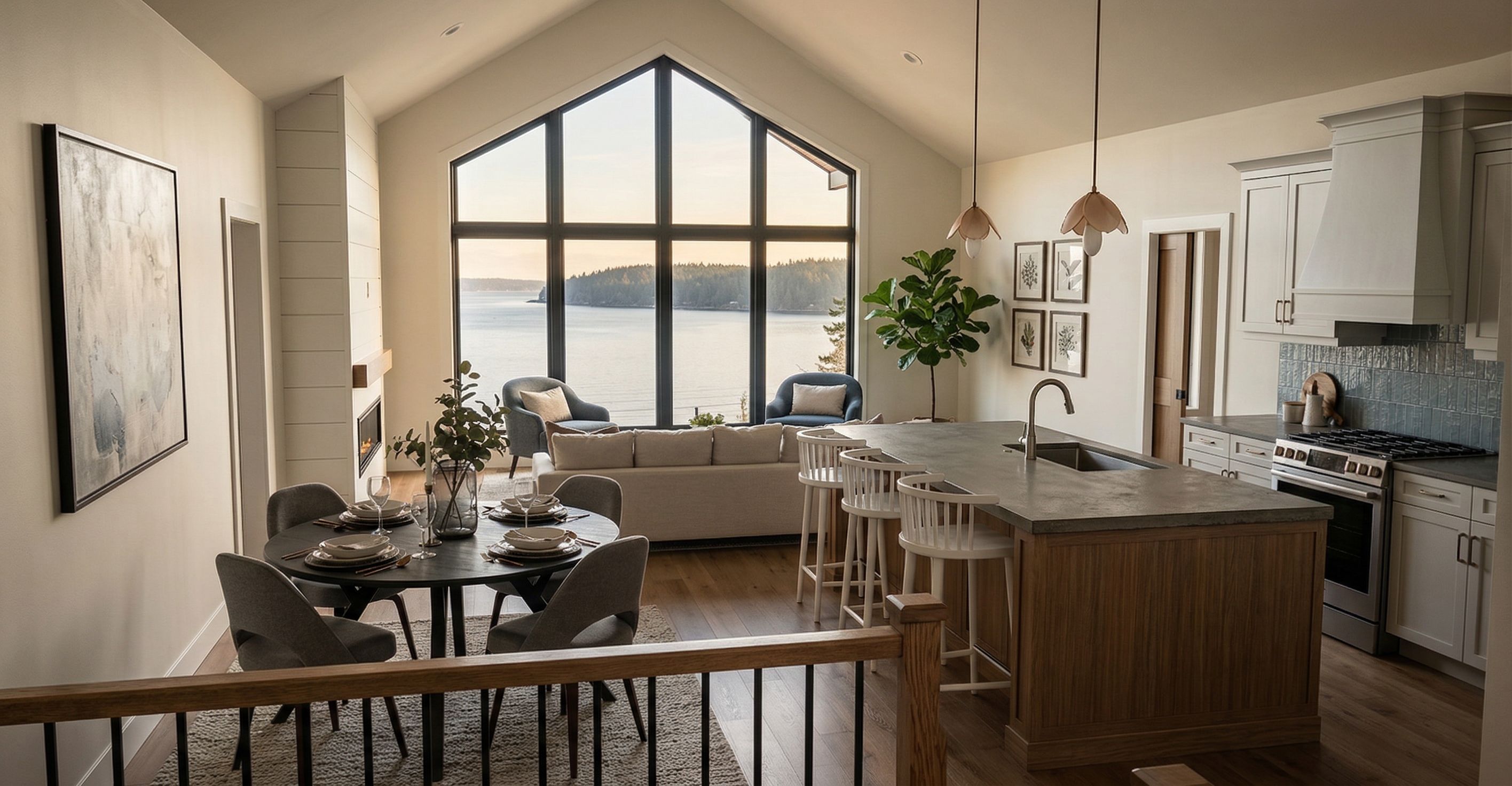 PromptPhoto of a modern open-concept living space, featuring a spacious living room with a large, vaulted ceiling and expansive windows that offer vibrant natural light. Emphasize the juxtaposition of warm wood textures against sleek cabinetry and stainless steel appliances in the kitchen area. Include stylish furniture elements like a round dining table and comfortable sofas. The scene is set in a cozy, inviting atmosphere during the afternoon light, casting soft shadows. Captured from a slightly elevated angle with a wide lens to encompass the entire flow of the layout, highlighting its harmonious design. Millwork range hood in white to match cabinets, shiplap fireplace accent, pocket door to hall near kitchen, cozy home, nice high end decor, keep exact camera angle