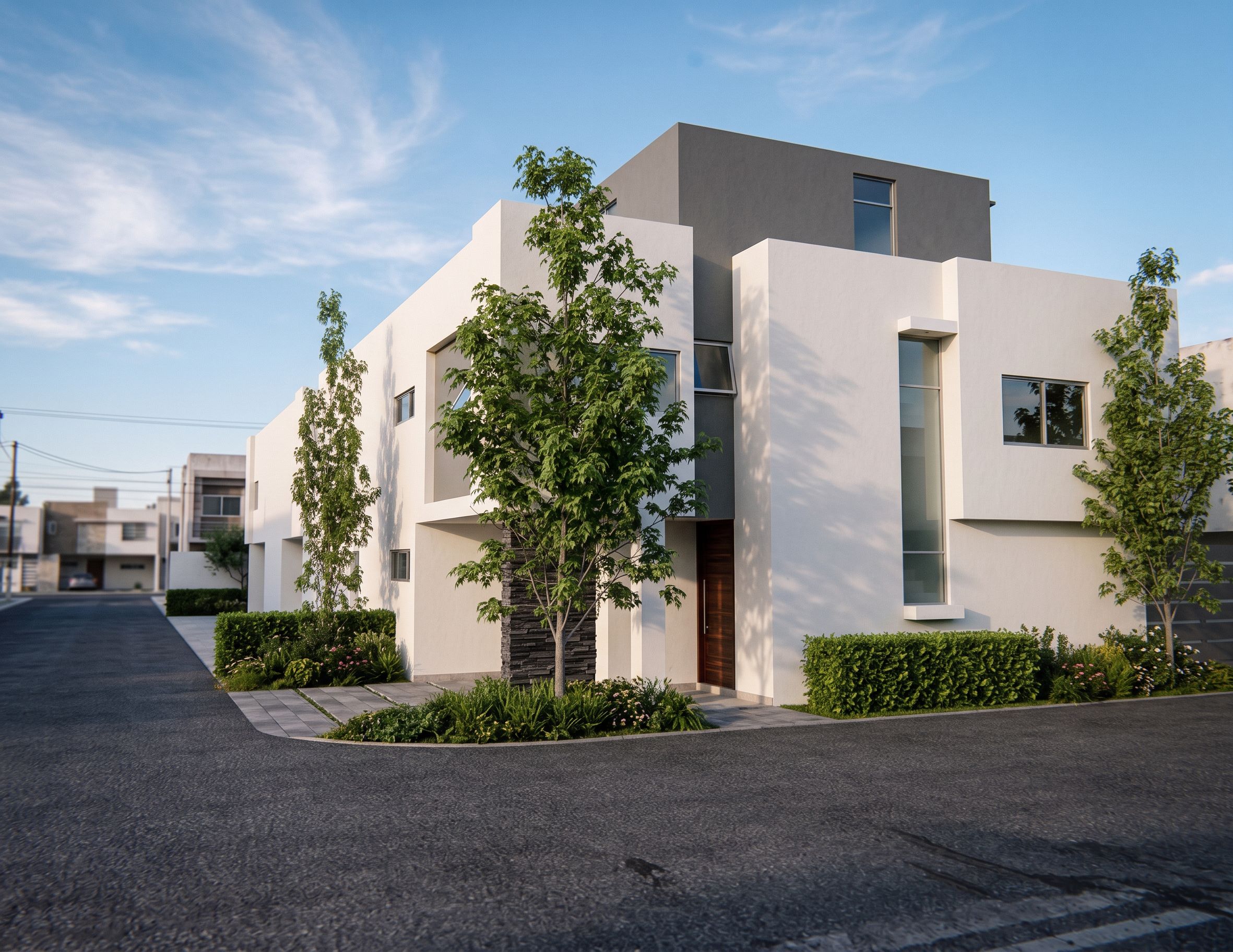 PromptPhoto of a modern residential building with smooth white stucco and dark stone contrasts. The architectural details include large angular windows and a flat roof. Surrounded by abundant vegetation and a neatly paved path, the scene is set in an urban context with a clear blue sky. Natural light highlights the textures of the materials, creating soft shadows at the end of the afternoon. Captured from a low angle to emphasize the height and depth of the facade, using a wide-angle lens for a broad view of the entrance and surrounding landscape. THE COLORS OF THE REFERENCE IMAGE ARE RESPECTED