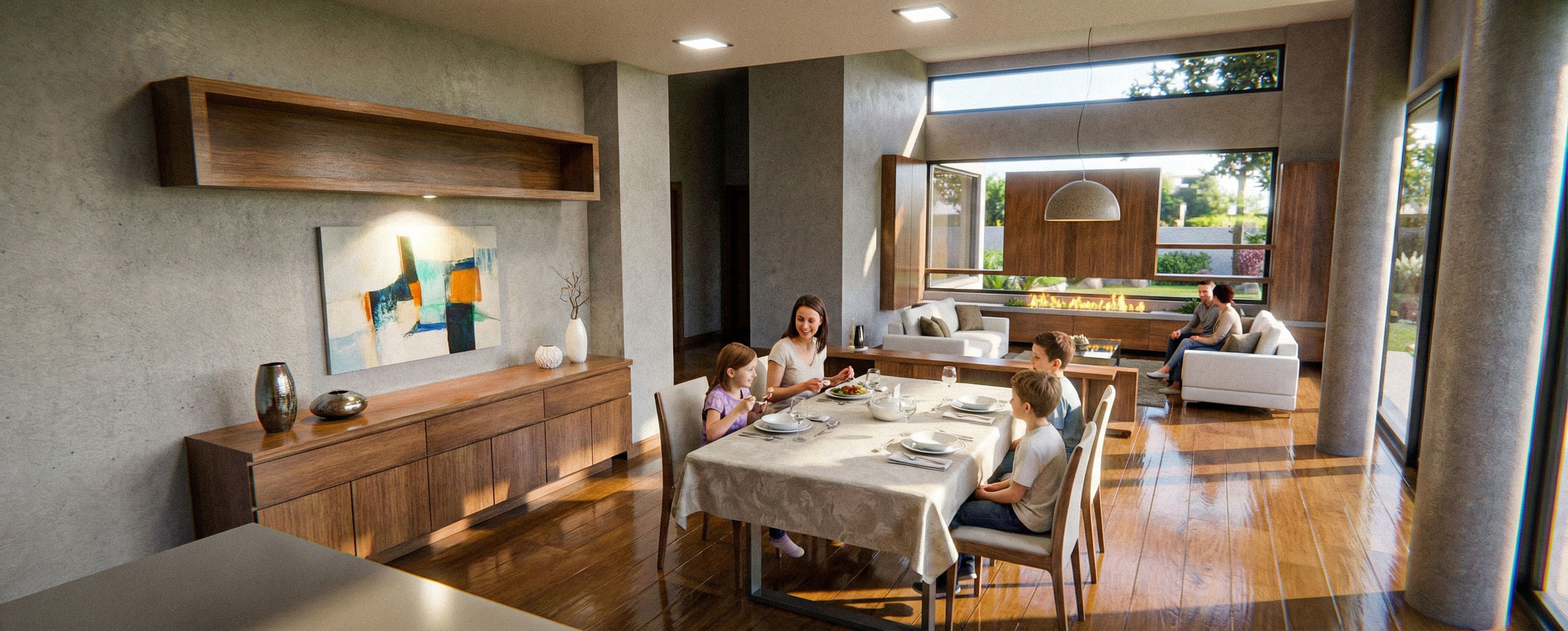 PromptPISO EN MADERA BRILLANTE, MUEBLES EN MADERA SEMI BRILLANTE, MUEBLE DE LA IZQUIERDA CON CUADRO MODERNO CON SPOT DE LUZ OBJETOS DE DECORACION, MESA DE COMEDOR RECTANGULAR MODERNA CON MANTEL Y JUEGO DE LOSA ELEGANTE CON 8 PUESTOS, UNA MEJER Y 2 NINOS SENTADOS COMIENDO. AL FONDO EN LA SALA JUEGO DE SOFAS BLANCOS CON COJINES Y UNA PAREJA SENTADA CHIMENEA PRENDIDA, LAMPARA COLGANTE EN LA SALA, ILUMINACION LED EMPOTRADA DE FORMA CUADRADA EN EL TECHO DEL COMEDOR. EXTERIOR MOSTRANDO UN DIA SOLEADO, keep exact camera angle