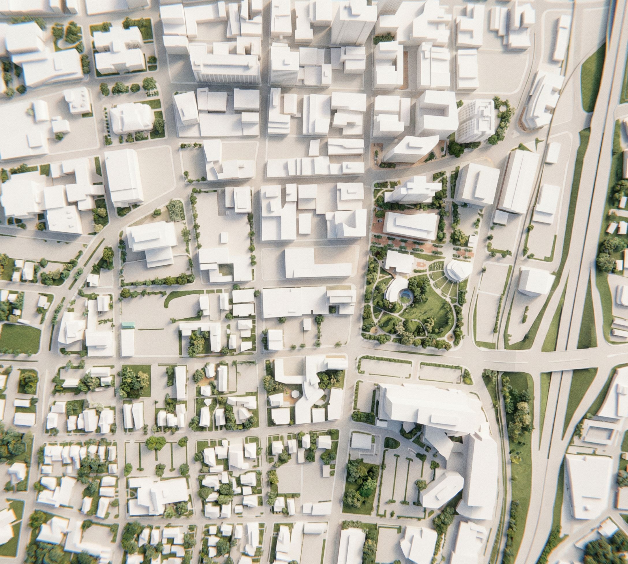 recreate this google earht screemshot exactly do not chnage the position of any of the buildings leave it the exact same simply just recreate it in a a nice white massing artistic masterplan form