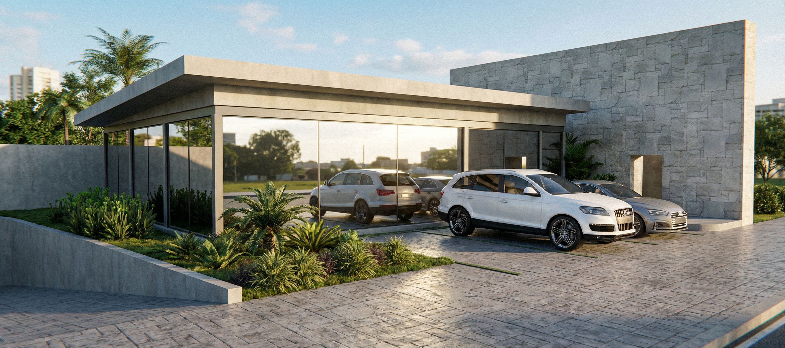 Foto de una estructura comercial moderna con grandes fachadas de vidrio y un amplio techo plano. Se destacan las líneas elegantes y el diseño minimalista, mostrando materiales como vidrio tipo espejo y concreto. Ubicada en un entorno urbano sin edificios , un estacionamiento para tres autos ,con alguna vegetacion y jardin ,creando un ambiente dinámico. La luz de la mañana proyecta sombras suaves, iluminando los detalles de la estructura. Captura la perspectiva a nivel de los ojos, utilizando un objetivo gran angular para resaltar la prominencia del edificio y su entrada acogedora, mejorando la visualización arquitectónica.