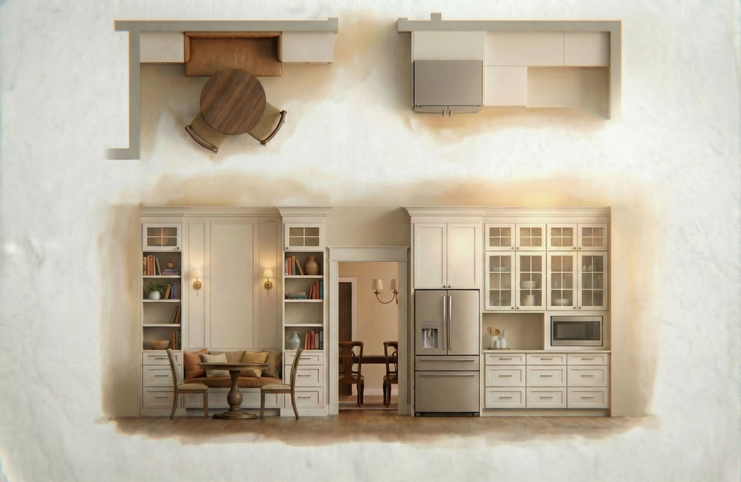 Promptkeep everything the same but push the microwave back so it's recessed into a niche in the wall , keep exact camera angle