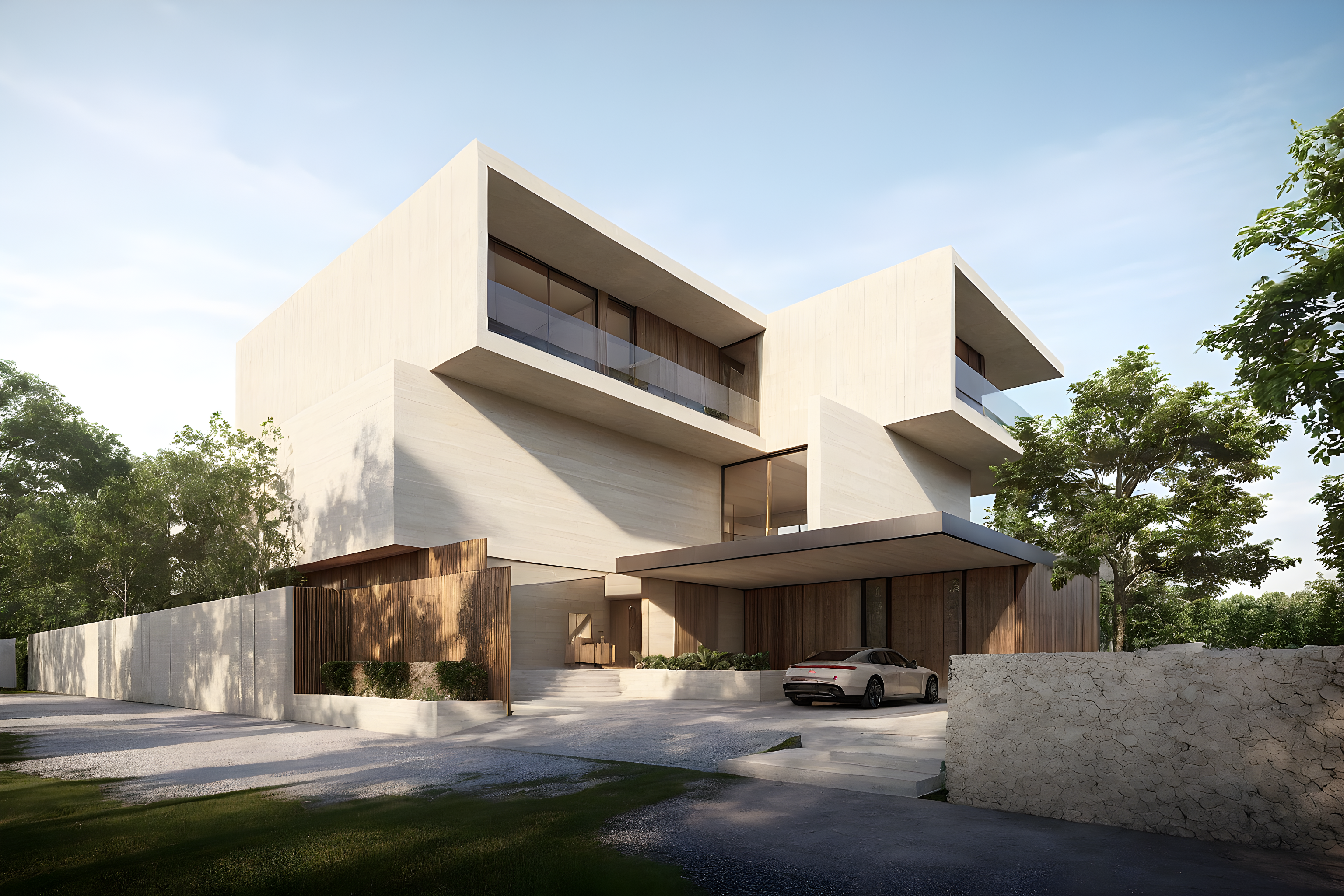 Promptnatural sunlight vibrant forest landscape smooth beige limestone keep building line keep wooden wall with fine grooved line keep concrete drive way