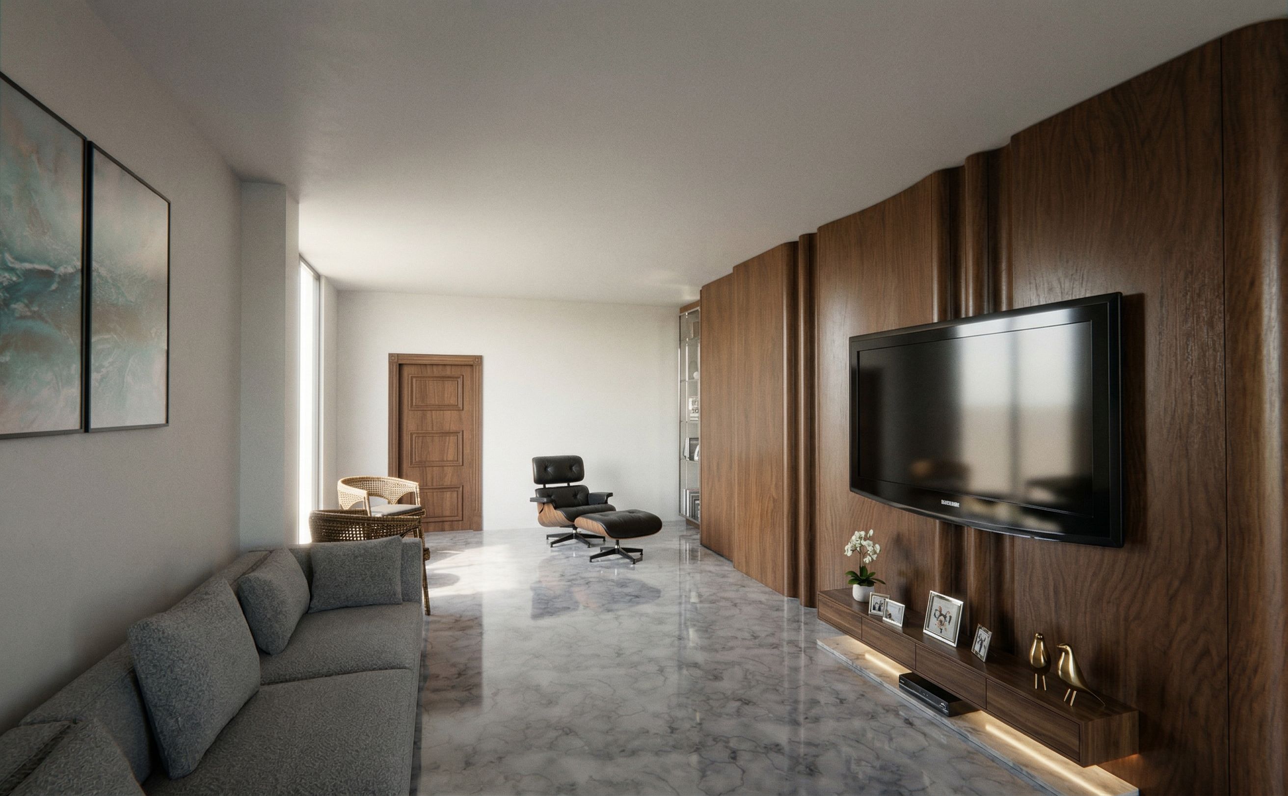 Photo of a modern living room featuring sleek wooden paneling and contemporary furniture. Emphasize the rich textures of the polished wood, the elegant marble flooring, and the luminous decorative elements on display. The space is illuminated by soft natural light flooding through large windows, casting gentle shadows. Capture the scene from a low angle, focusing on the stylish Eames chairs and minimalist TV unit, using a wide-angle lens to enhance the sense of space and depth in this architectural visualization., keep exact camera angle