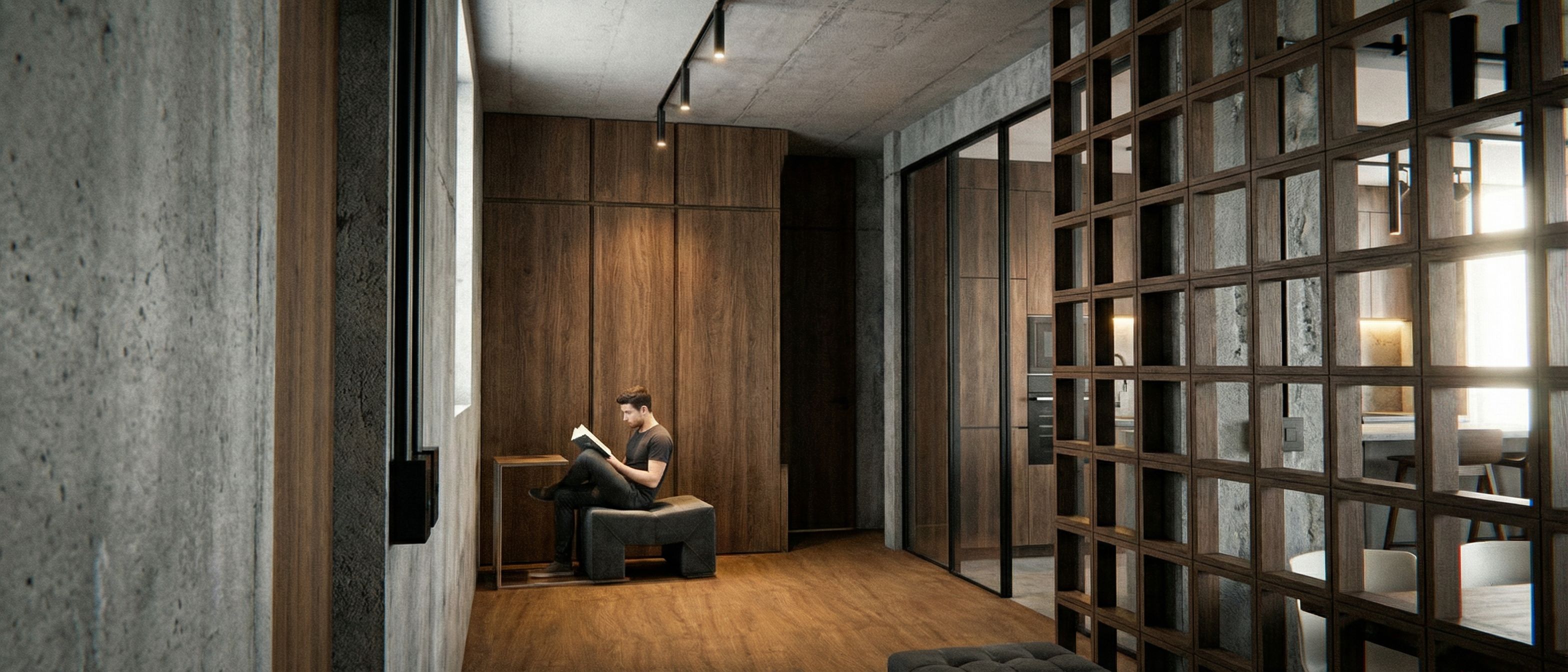 PromptEstilo industrial, no cambies distribución, suelo madera medio, muros grises hormigón visto , cocina de robe, chic, elegante arquitectónico , keep exact camera angle