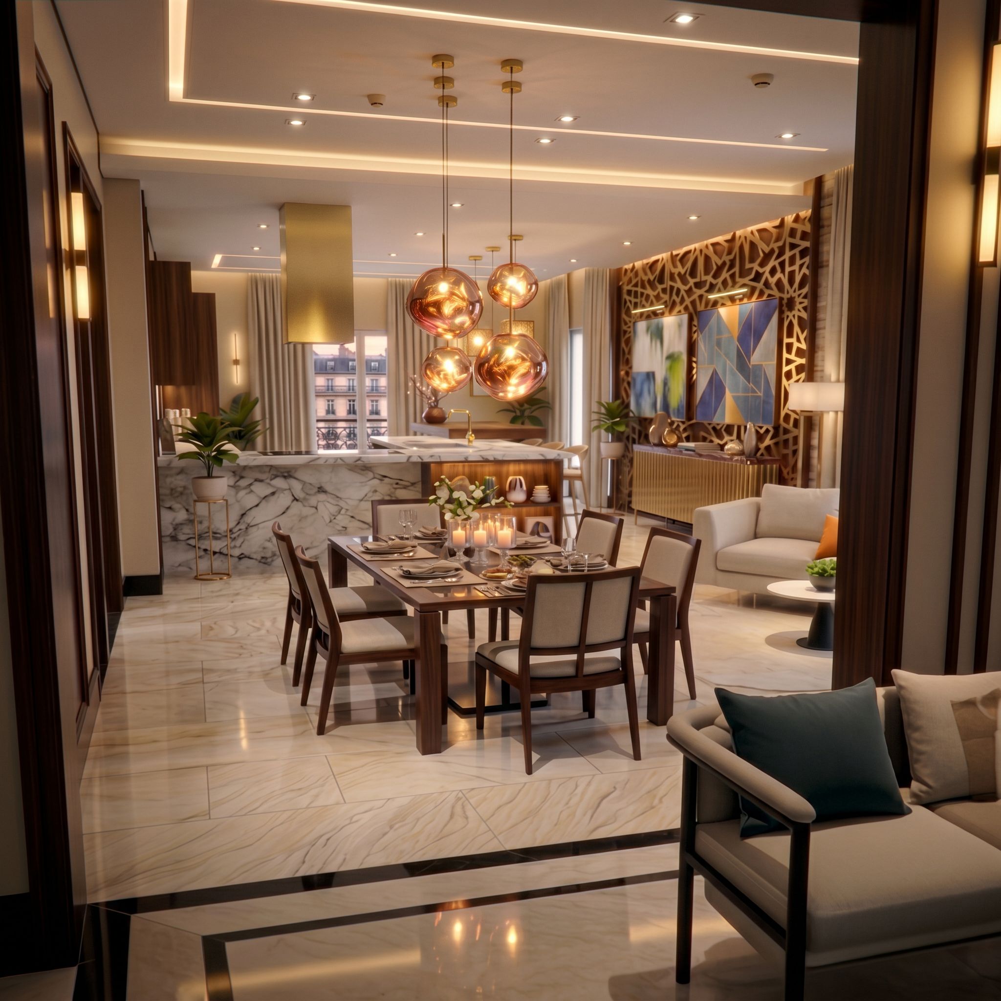 respeta la arquitectura de interiores y el diseño general, añade un estilo fotorrealista al mas mínimo detalle en cuanto a luz, calidad de las texturas y enfoque de la imagen y cambia sólo los siguientes aspectos: Pon el mismo plato de picoteo y todos los objetos de la mesa de comedor con la misma organización tal como aparecen en la mesa de comedor de la imagen de referencia 2 Elimina la caja rectangular que está entre las sillas en el suelo bajo la mesa. Elimina el objeto oscuro con forma de botella que está detrás del silloncito con los cojines. mejora la calidad de la textura de la encimera de mármol de la cocina respetando la misma forma. Cambia el color acero de la campana por dorado al igual que el grifo de la cocina. conserva la misma forma y color de los apliques dorados de las lámparas en el techo. , keep exact camera angle