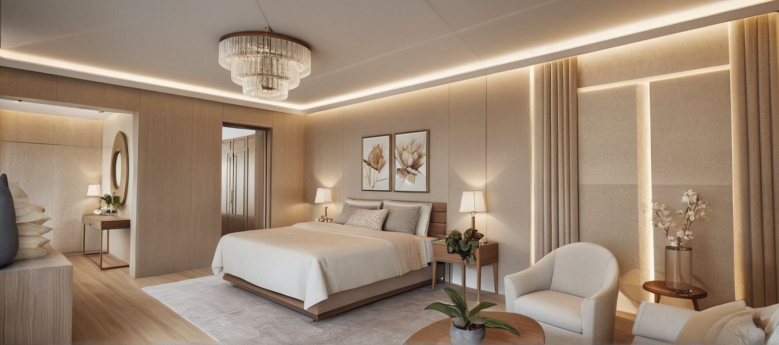 PromptLuxury modern bedroom, wood floors, beige wallpaper, iluminated inclined ceiling, modern chandelier