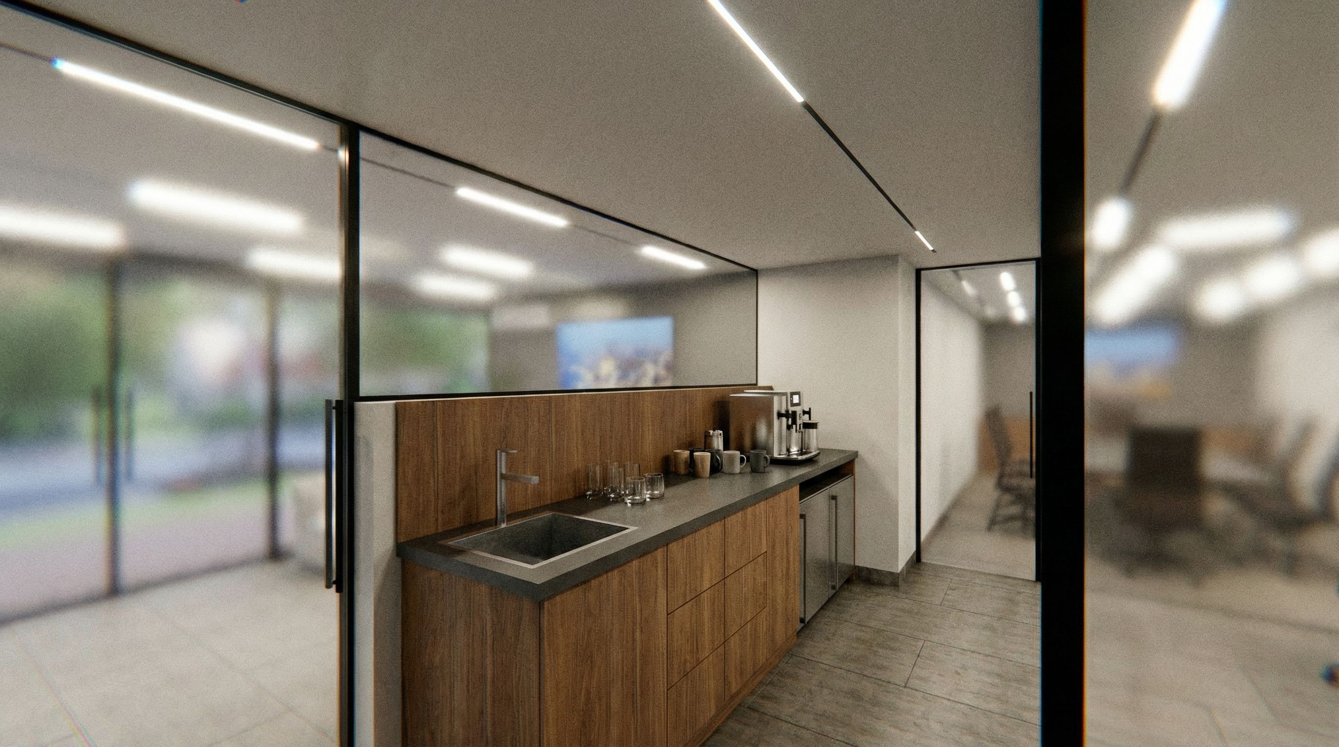 Porfavor convierte este render en una imagen realista añade el efecto de la luz no puedes modificar el tono de la madera, añade una cafetera y algunas tazas o vasos en el tope del mueble ya que es una kitchenette, los cristales colocalos esmerilados , manten el angulo de la nueva imagen que te añado no puedes modificar el diseño, keep exact camera angle