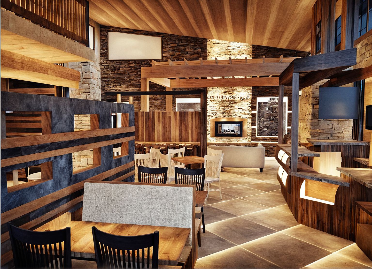 Photo of a modern café interior, featuring warm wood paneling and stone accents. Emphasize the cozy seating arrangement with wooden tables and chairs, complemented by a stone fireplace. Large windows bring in natural light, casting soft shadows across the floor tiles. Capture a wide-angle view to showcase the open layout, highlighting the intricate ceiling design and architectural details. The time of day is late afternoon, enhancing the inviting atmosphere with golden light.