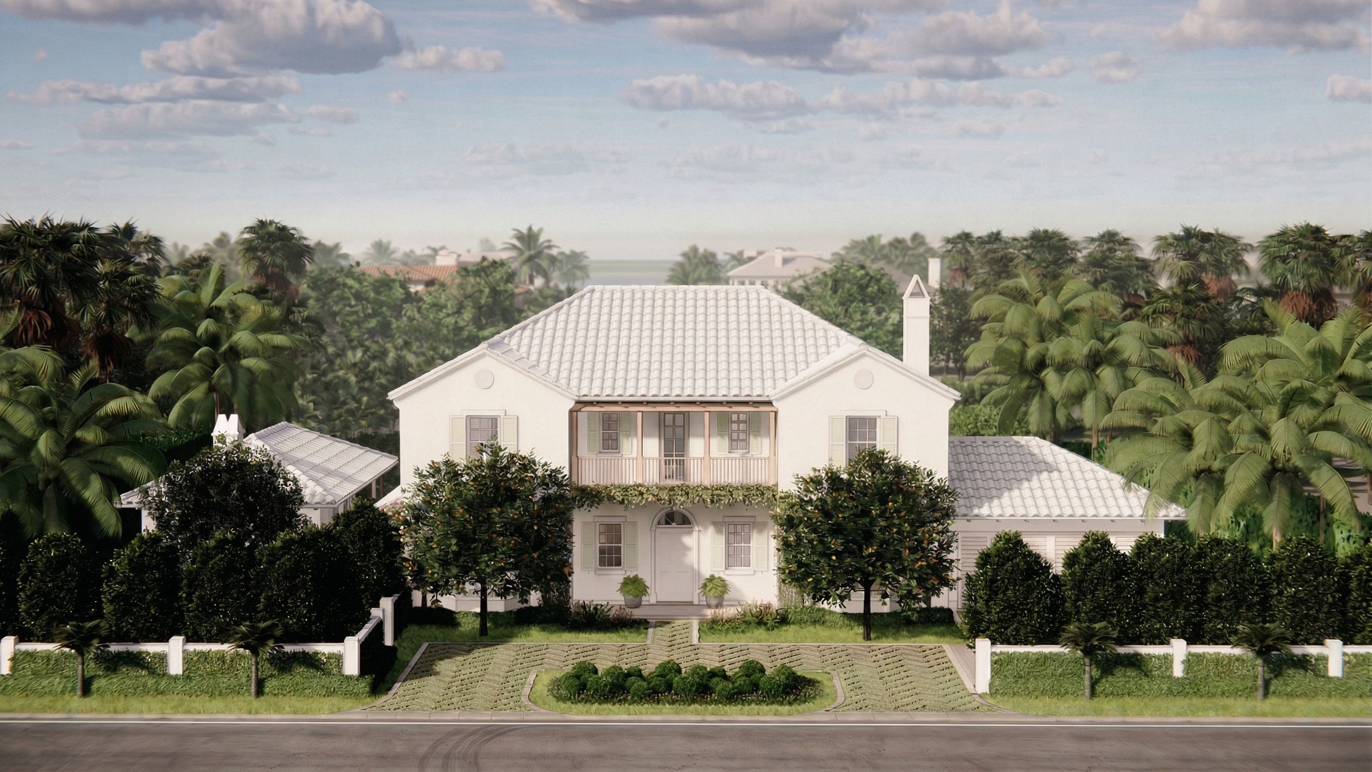 PromptCreate an ultra-photorealistic architectural rendering from the provided image. DO NOT change the architecture of the main house in any way. Keep all proportions, geometry, and camera angle exactly the same. Completely remove and regenerate the background and sky. Do not preserve or reuse any part of the existing background. Replace the background with a realistic Palm Beach coastal neighborhood: Use dense tropical landscaping (palms, hedges, layered greenery) to cover most background buildings Neighboring houses should only be slightly visible through trees and appear soft and low contrast Vegetation should dominate the background, not architecture Add a distant coastal horizon: Subtly show the Palm Beach inlet and the Riviera Beach barrier island far in the distance Keep this very soft, slightly hazy, and low contrast It should sit above the tree line and feel realistic, not sharp Replace the sky completely: Use a realistic South Florida sky with soft cumulus clouds Add depth and variation in the clouds Slight haze near the horizon Balanced brightness, not washed out and not dull Improve the road in the foreground: Realistic asphalt texture with subtle tonal variation Slight tire wear and natural irregularity Clean, high-end residential look (not cracked or distressed) Enhance materials (do not change them): Smooth white stucco (warm creamy white) with subtle variation White concrete tile roof with depth and shadow Light lime-washed cypress wood with minimal grain White aluminum window frames with slight reflectivity Lighting: Soft, diffused daylight (not golden hour) Even lighting across all surfaces Gentle shadows for depth Do not crop the image. Do not change perspective. Do not alter the architecture in any way. Final result should feel like a real luxury home in Palm Beach with lush landscaping, a soft coastal horizon, and a high-end photorealistic environment., keep exact camera angle