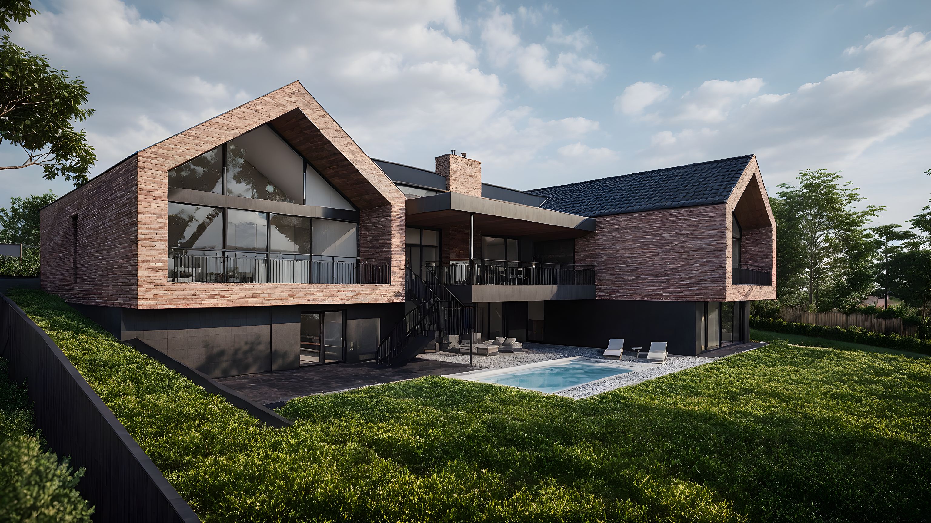 Promptvilla modern architecture, expresive daylight, bricks facade, pitched black tile roof,