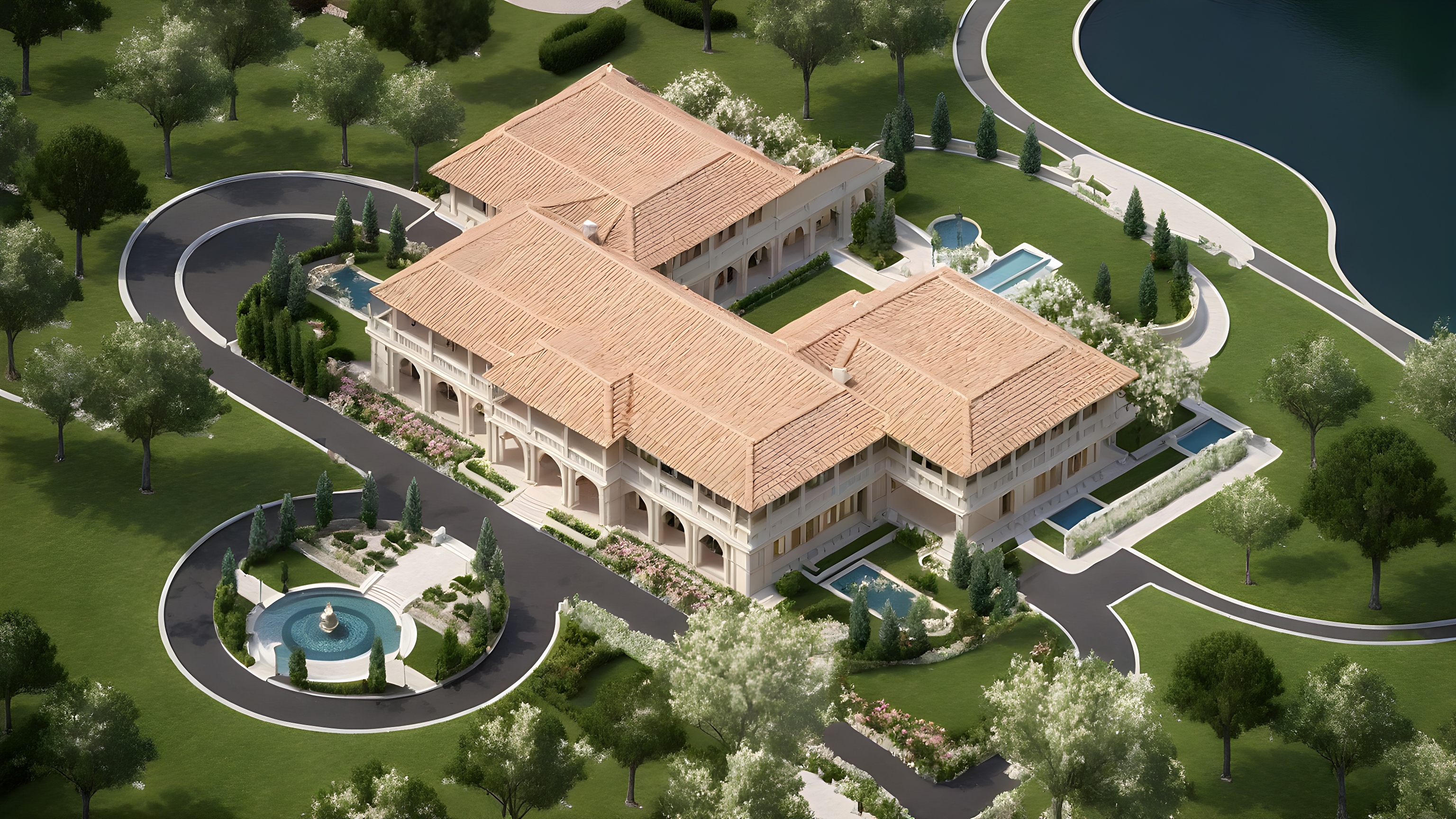 Smooth Beige Limestone, Italian style brown tile roof, arches, columns, fountain, pond, manicured lawn, trees, asphalt driveway, lake, blossom flowers, Sunny summer, daytime, Forest environment, mountain view, more dense big trees