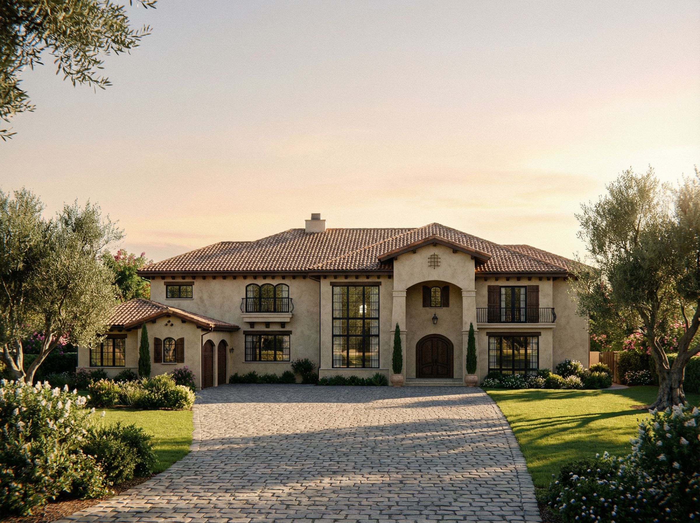 PromptRender this Mediterranean villa with large black framed windows. Dark stained wood accents. Terracotta tile roofing. Large two car courtyard garage on left side with two arched garage doors. Pulled forward. Textured stucco finish throughout. Wrought iron railing. Established neighborhood setting in early morning with smooth shadows and lots of lush greenery.