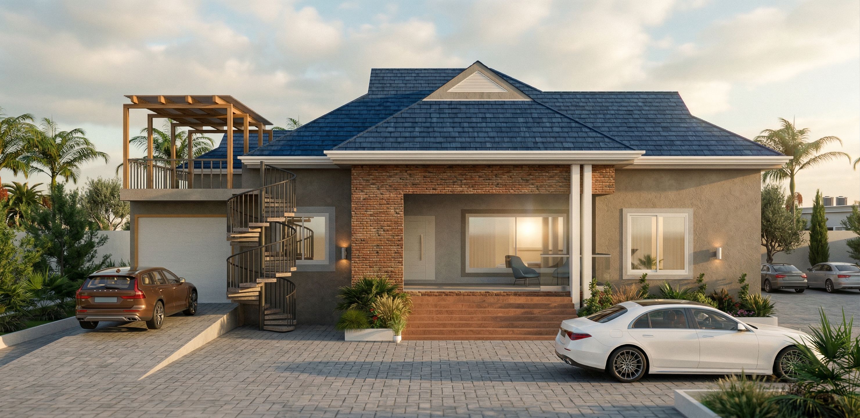 PromptPhoto of a contemporary residential building with a welcoming facade, featuring textured brick and a striking blue shingles roof. The design includes a spiral staircase and a spacious balcony, surrounded by lush palm trees. In an urban setting, soft natural lighting captures the afternoon ambiance, enhancing the structure's details. Shot from a slightly elevated angle to showcase the entrance and surrounding driveway, using a wide-angle lens to emphasize depth and context. Natural shadows play along the walls, creating a tranquil and inviting atmosphere., keep exact camera angle