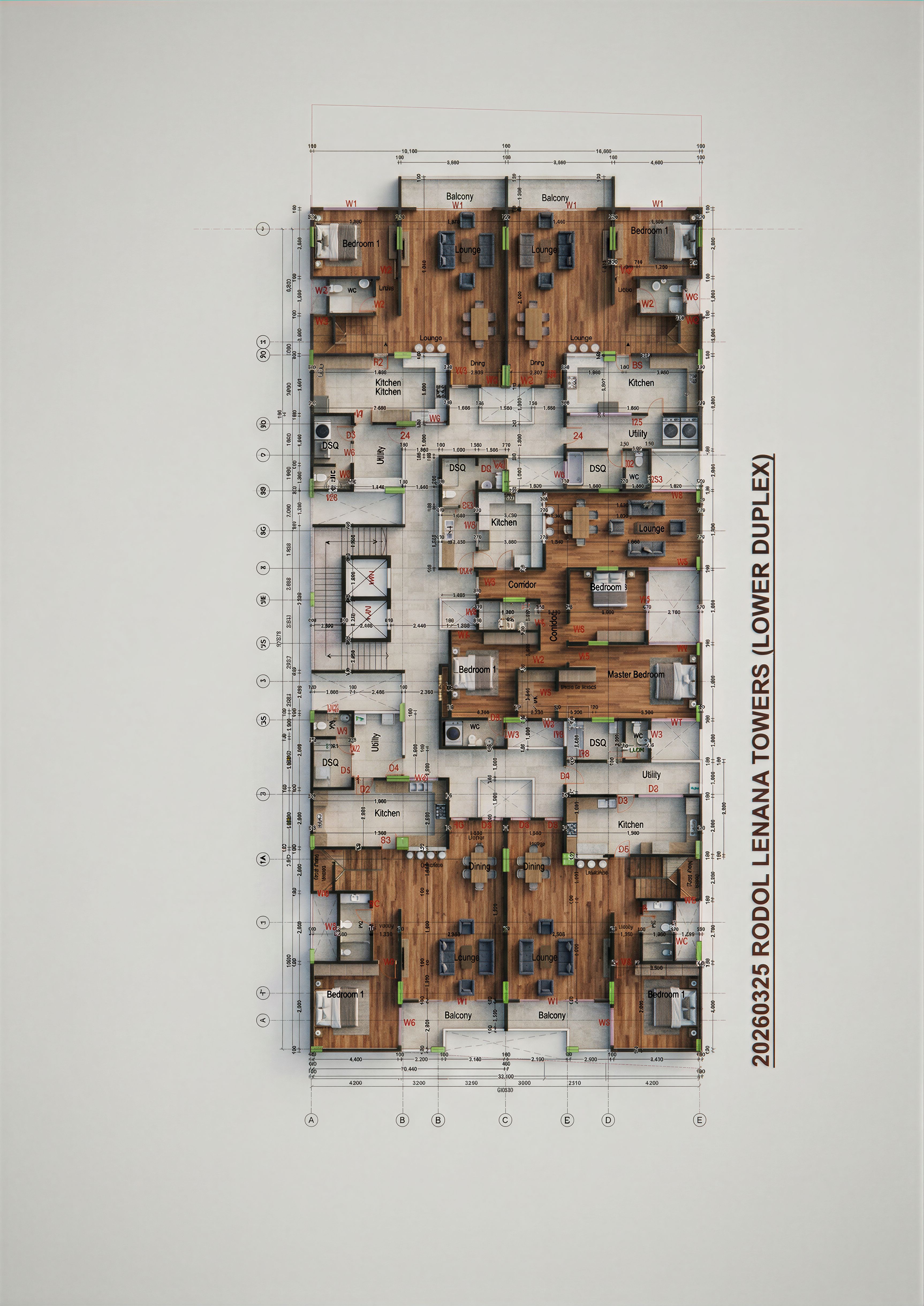 EnhancedPromptLAYOUT SHOWING THE INTERIOR OF A HIGH END APARTMENT. CLEARLY SHOW THE PARTITIONS WITH THE FLOOR FINISHES. USE TIMBER AND CERAMIC TILES ON THE FLOORS. INCLUDE A WASHER AND DRIER IN THE UTILITY AREA. INCLUDE INBUILT DOUBLE DOOR FRIDGE NEXT TO THE PANTRY. CLEARLY INDICATE THE WASHROOMS. MAKE LAYOUT HIGH RESOLUTION OF 8K. USE THE REFERENCE FILE BUT MAINTAIN ORIGINAL ANNOTATIONS AND LAYOUT DESIGN. MAINTAIN ORIGINAL DIMENSIONS AND ANNOTATIONS AND MAKE THEM VERY CLEAR. RENDER IMAGE HIGH RESOLUTION 8K. MAINATIN ORIGINAL LAYOUT DESIGN., keep exact camera angle