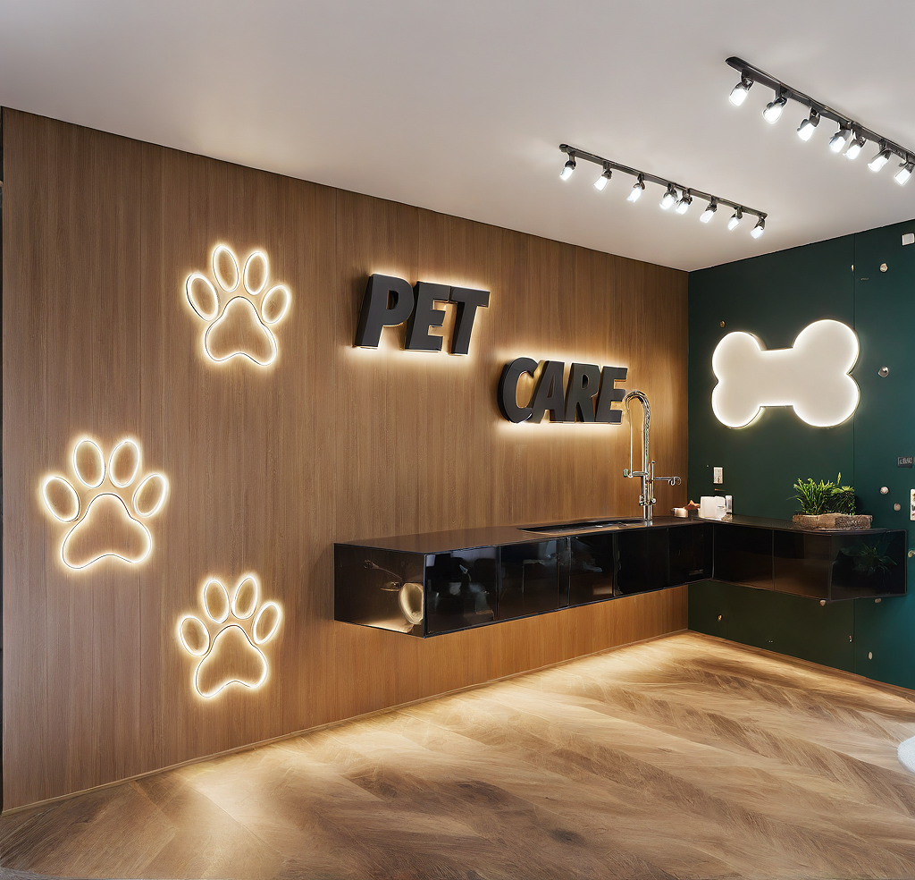 Promptmake a pet care space, confortable, colorful, modern and very realistic, only artificial lights