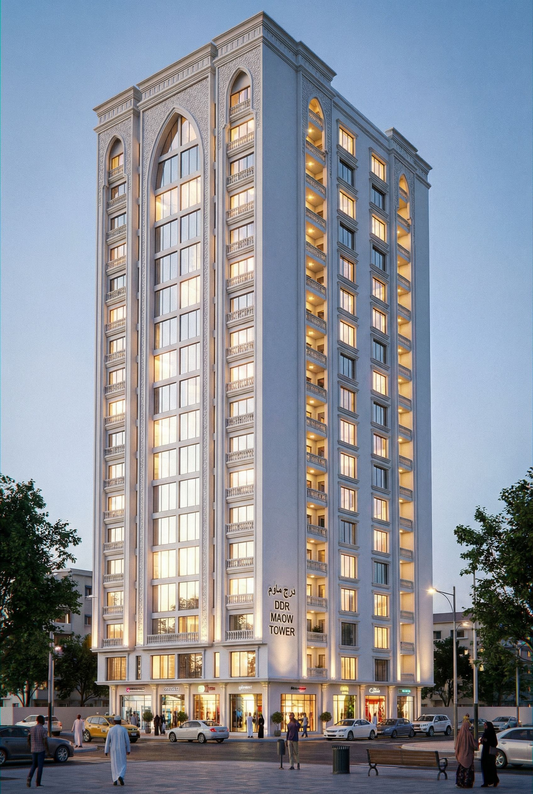 A RESIDENTIAL DEVELOPMENT WITH GROUND FLOOR AS COMMERCIAL AND 20 STORIES APARTMENT COMPLEX. MAKE GLASS CLEAR , REFLECTIVE AND REALISTIC. TURN ON THE LIGHTS IN THE BUILDING. USE WHITE WALL MASTER ON THE BUILDING. MAKE THE BUILDING TO HAVE A CONTEMPORARY ARABIC CONCEPT. WRITE THE NAMES "DDR MAOW TOWER" ON THE BUILDING. INCLUDE PEOPLE OF SOMALI AND AFRICAN ORIGIN IN THE IMAGE. SHOW WHOLE BUILDING. MAKE IMAGE HIGH RESOLUTION OF 8K. INCLUDE ONE BIG ARABIC ARCH IN THE MIDDLE AND TWO SMALLER ONES ON BOTH SIDES. INCLUDE MOULDINGS AROUND OPENINGS AND WINDOWS. SHOW WHOLE BUILDING AND THE ARCHES SHOULD RUN FROM THE TOP OF THE BUILDING AND TERMINATE AT FIRST FLOOR. INCLUDE SOME FALSE BALCONIES ON THE FRONT FACADE. MAINTAIN THE ORIGINAL CAMERA ANGLE IN THE ORIGINAL IMAGE., keep exact camera angle
