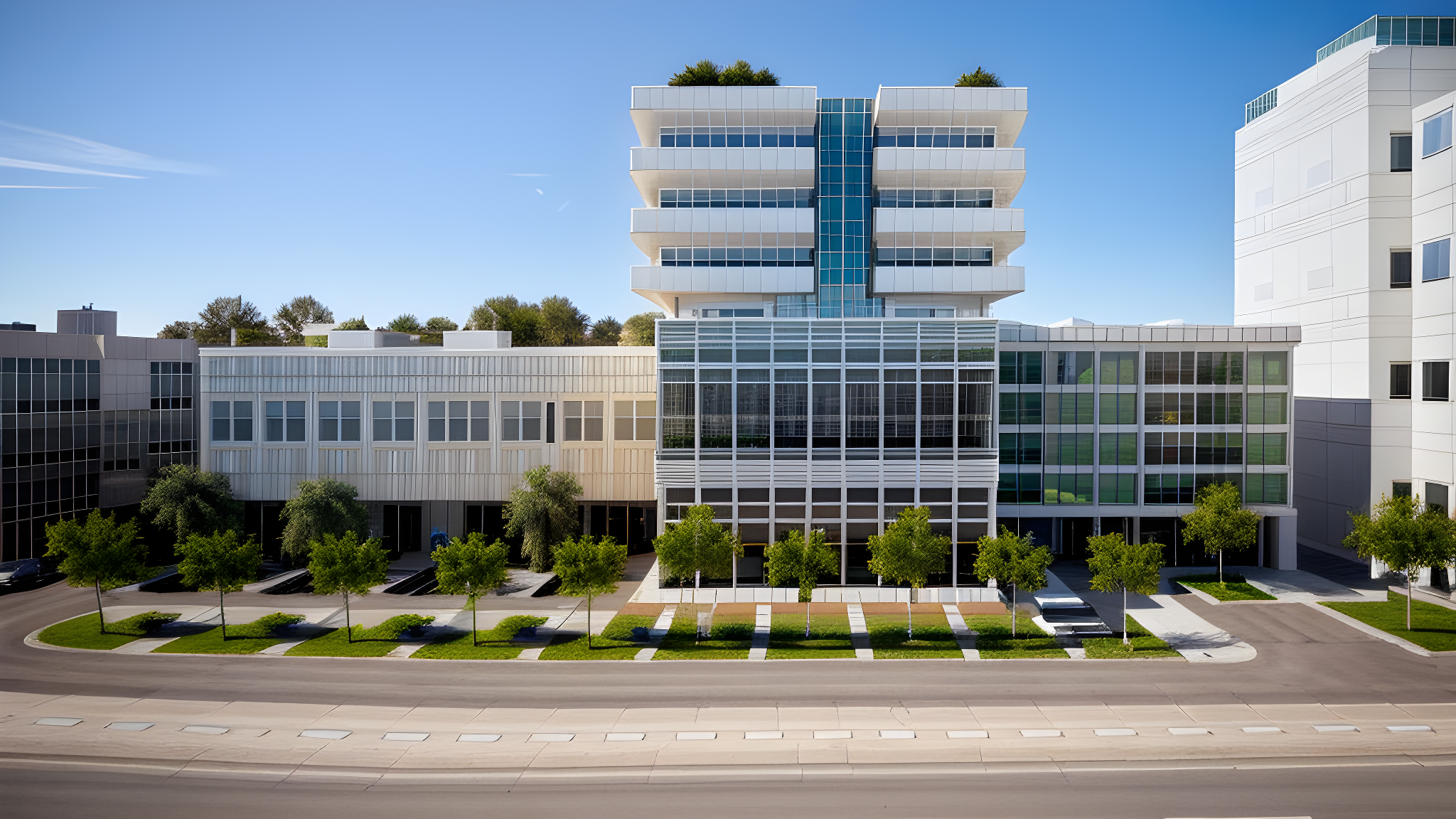 Promptoffice building, white plaster facade and curtain wall, and grass and vegetation in front of the building