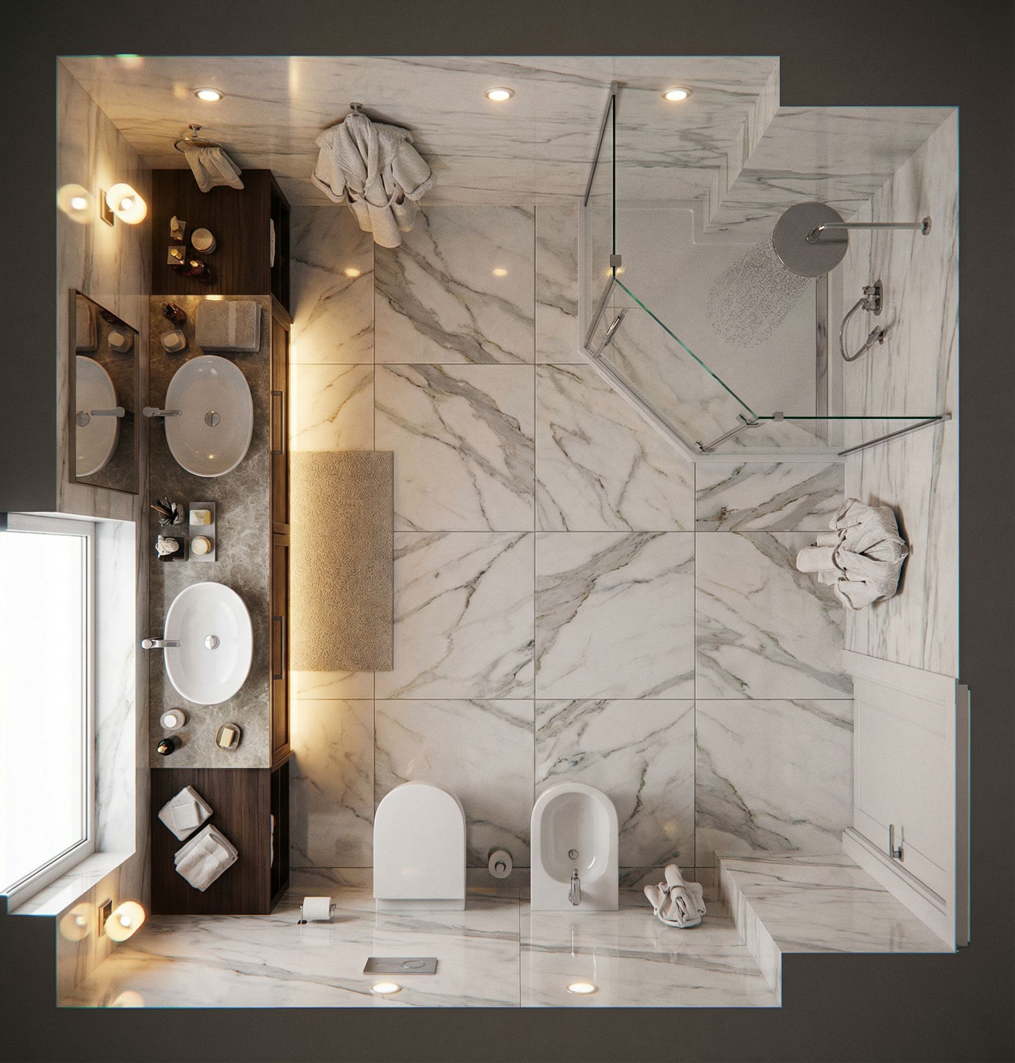 this is a plan for a villa bathroom , generate a 3d plan rendered design for this bathroom floor plan , style to be as hotels bathrooms style , luxury , keep exact camera angle