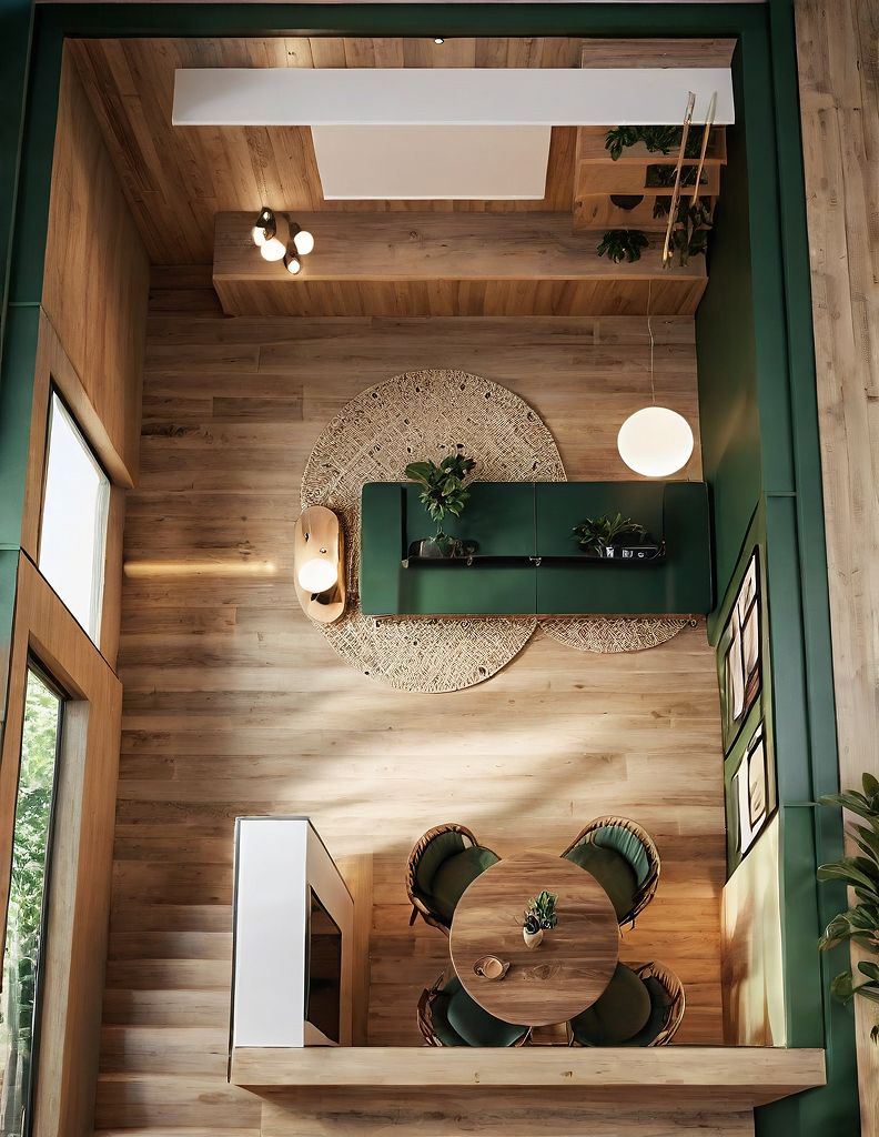 Promptliving room, tv spot, beige walls, spike wood floor, boho style, warm vibes, green wall, round table,