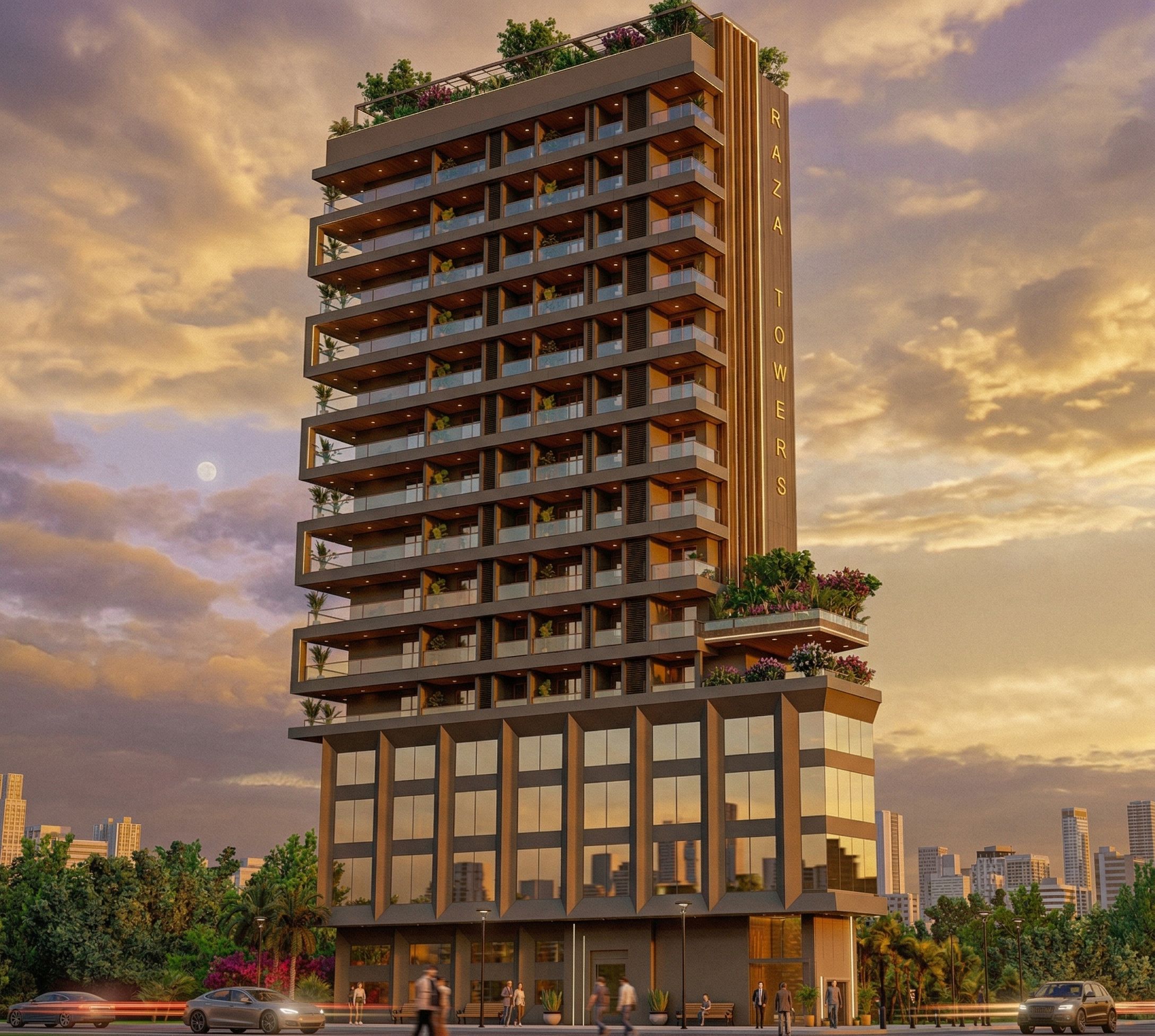 Prompta super realistic render of a high rise residential cum commercial building with a nice cityscape, change the paint of the building, keep exact camera angle