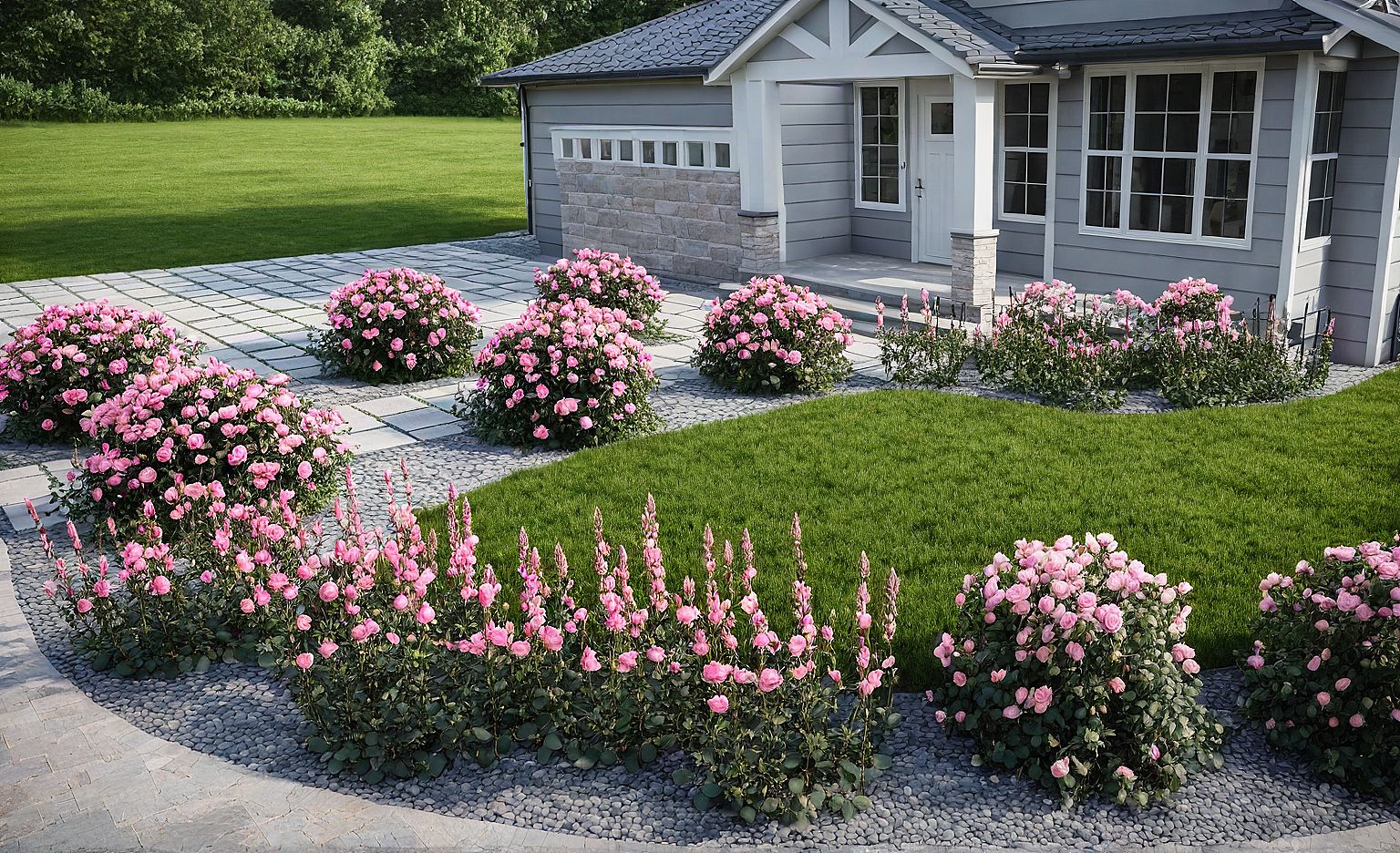 Promptmake this photo realistic, pink roses, pavers, lawn, gray stone bedding