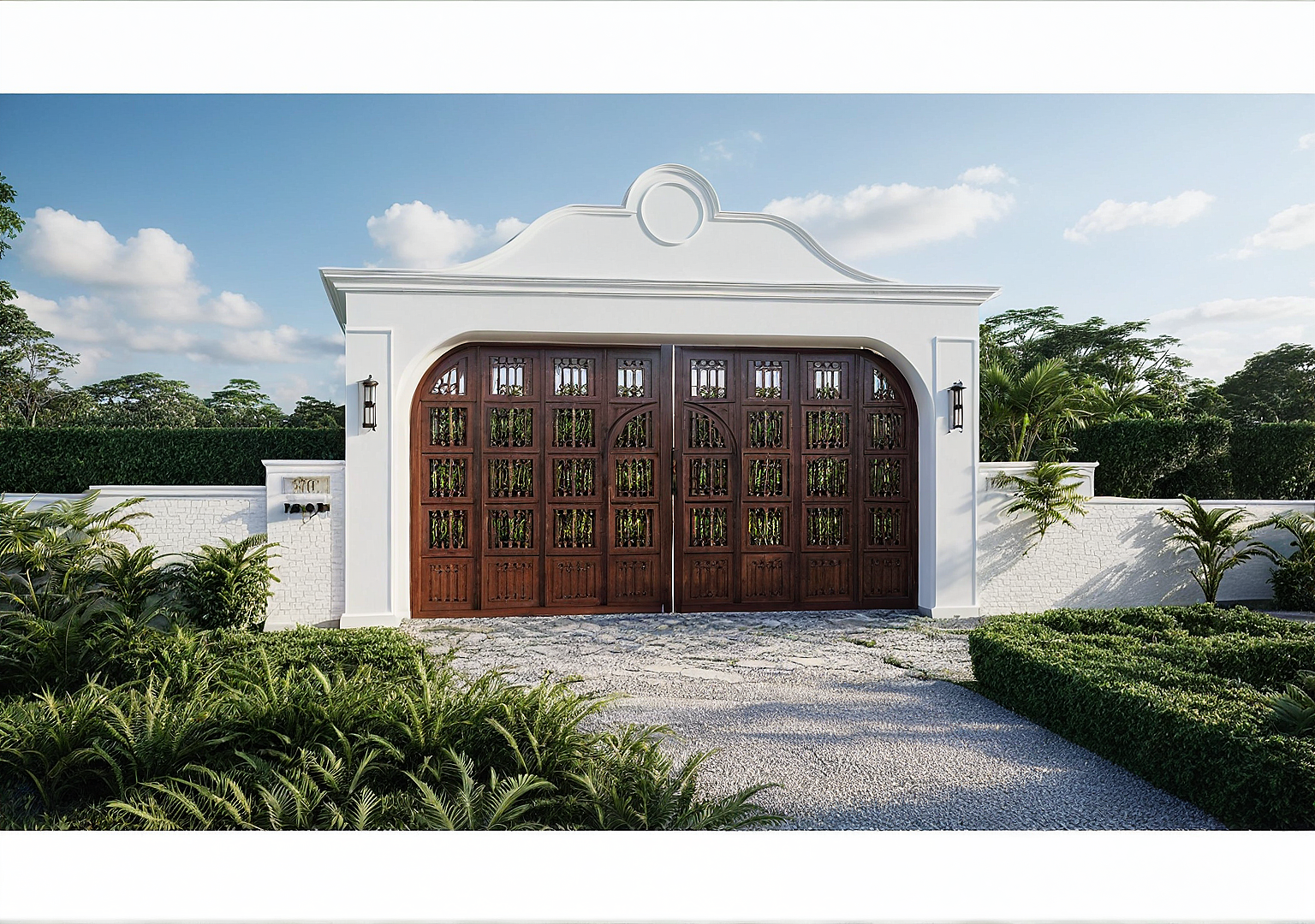 Make a nice detailed main gate design / photo for colonial style villa but use minimal simple mouldings as shown in uploaded picture and gate and villa as well surrounded by lots of greenery vegetation and plants and trees