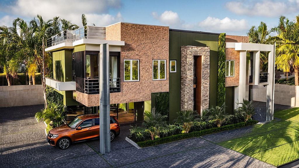 PromptPhoto of a modern two-story residential building featuring a blend of green and earthy tones, with textures of stone and brick. Surrounded by palm trees and a manicured garden, the structure includes large windows and a rooftop terrace. Soft afternoon sunlight casts dynamic shadows, enhancing the architectural details. Captured from a low angle, emphasizing the height and design, with a wide lens to encompass the surroundings and the parked orange car in the foreground. exterior wall lights, windows curtains