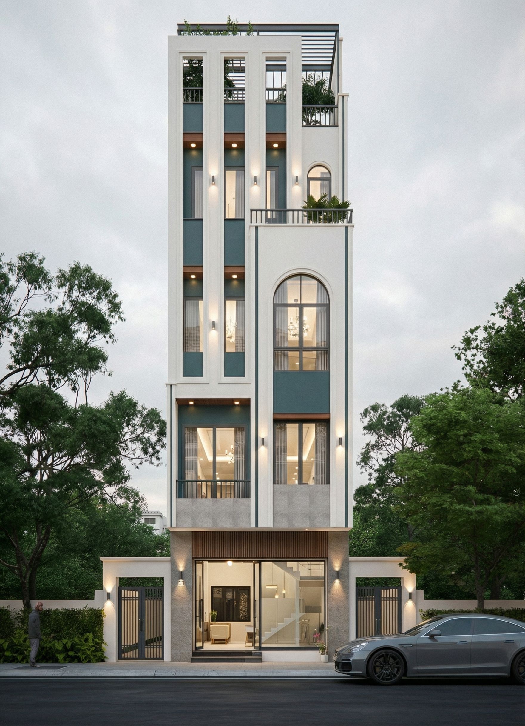 Photo of a modern residential building with a tall, slender design, featuring large windows and a mix of white and green facades. Emphasize the architectural details like the arched top windows and sleek balconies adorned with greenery. Set in an urban context with nearby trees and a well-maintained street, illuminated by a soft, early evening light that casts gentle shadows. Capture the scene from a frontal perspective, using a wide-angle lens to enhance the height and structure's visual impact while including elements such as a parked car and a passerby for scale.Maintain the original camera angle and shape, but enhance the colors for better brightness and contrast. Describe the materials: Glass with realistic reflectivity; door frame made of aluminum painted gray. The paint color is preserved to make it look more authentic., keep exact camera angle