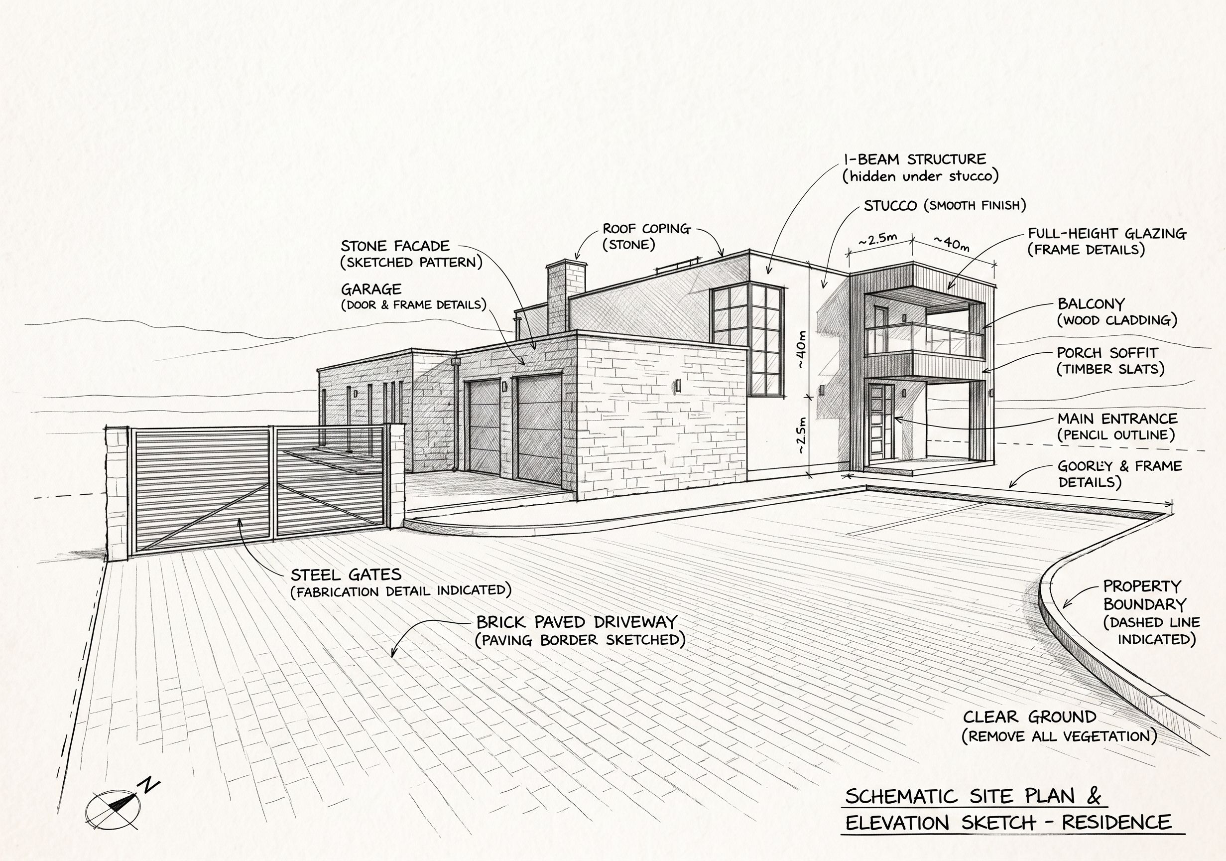 PromptTurn this render into a black and white sketch with annotations and without plants and no annotations for cars, keep exact camera angle