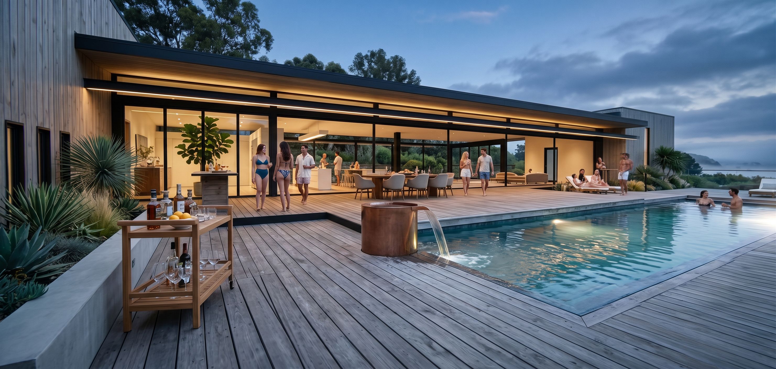 pool party, clean horizontal lines, put weight on the horizon , keep exact camera angle