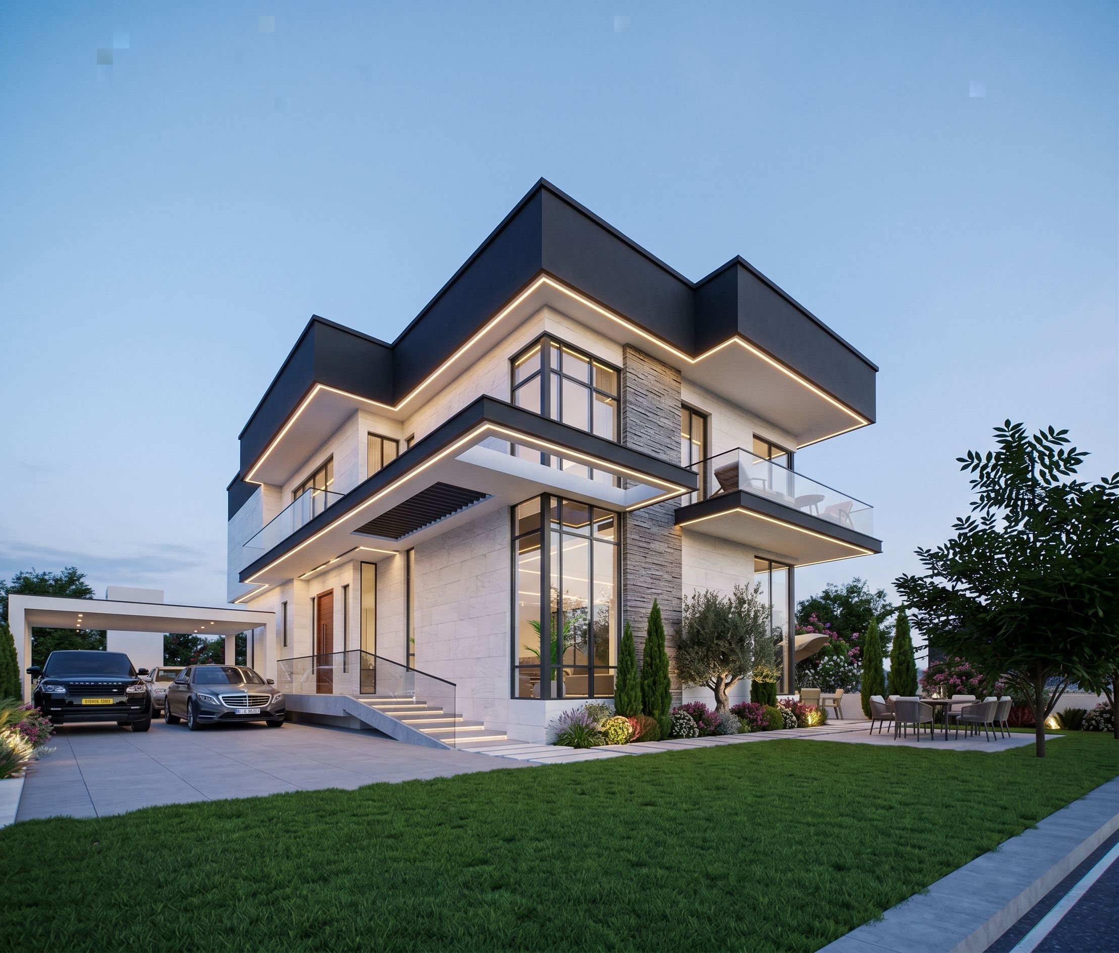 Luxury contemporary 2-story modern mansion, clean geometric design, flat layered rooflines, floor-to-ceiling glass windows, white textured stone cladding, dark charcoal accents, central stacked stone feature wall, warm LED strip lighting around roof edges and balconies, grand double-height glass entrance, wide front steps, upper balcony with glass railings and lounge chairs, covered carport with 2 luxury cars, outdoor dining area, landscaped garden, lush green lawn, ornamental plants, mature trees, dusk lighting, soft blue sky, ultra-realistic architectural render, elegant cinematic visualization., keep exact camera angle