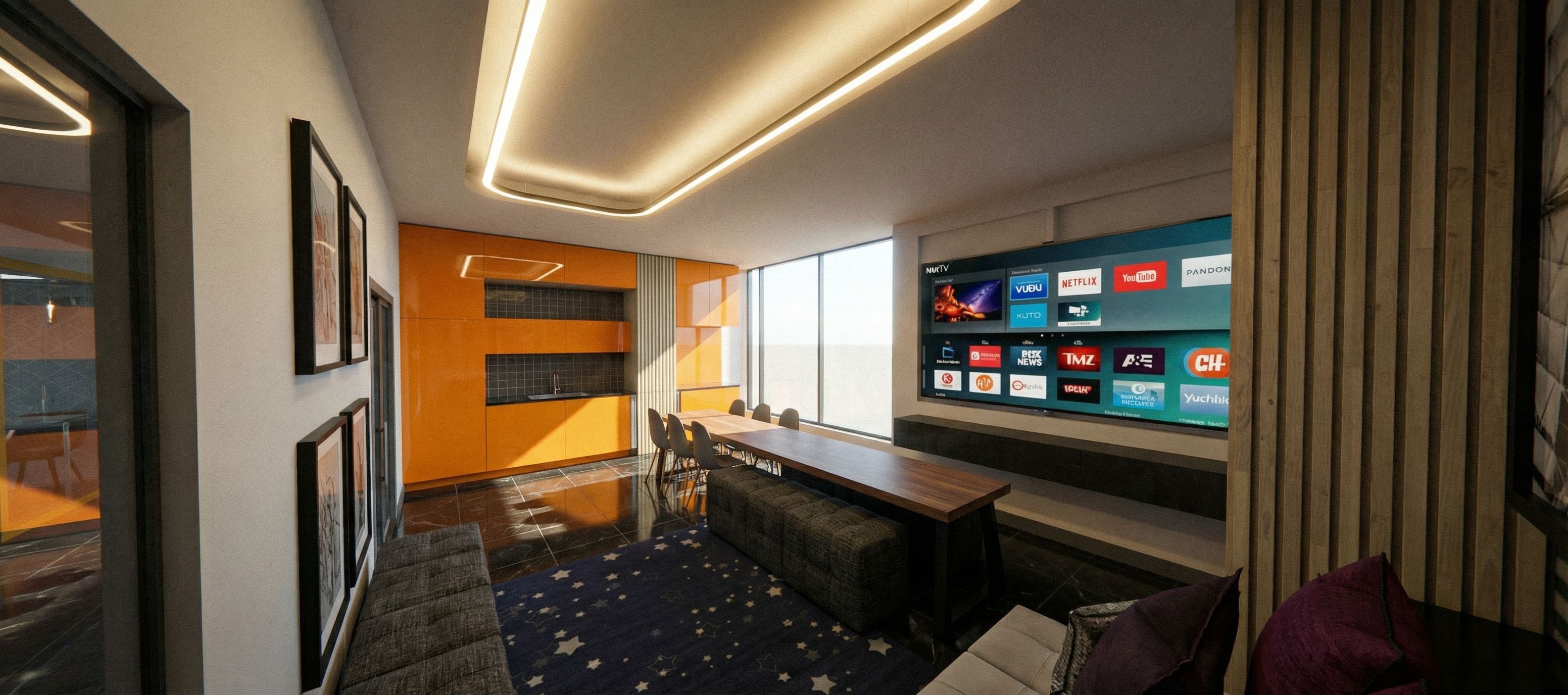 Prompta photorealistic render of an recreational room, black tiled floor, rich materials, clean line, linear light in the ceiling with grroves, wall art, keep exact camera angle., keep exact camera angle