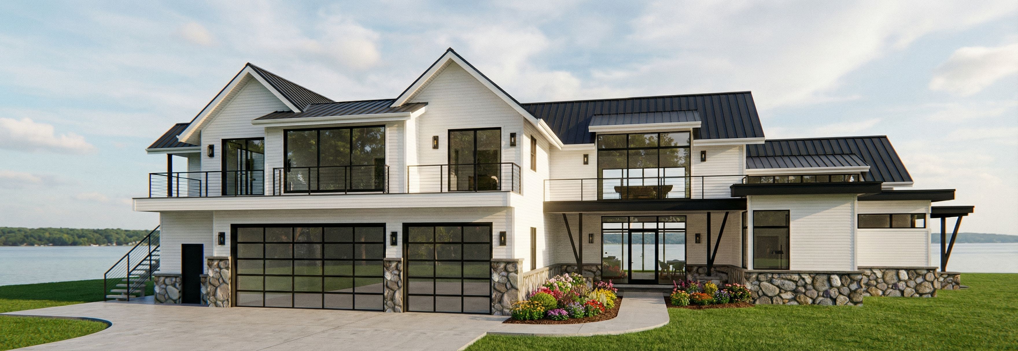 Make photorealistic rendering of the house, add lake view in the background per Reference Image 1, add flower bed between the garage door and front walkway, add flower bed in front of the post on the right of the entry, lawn in the front , keep exact camera angle