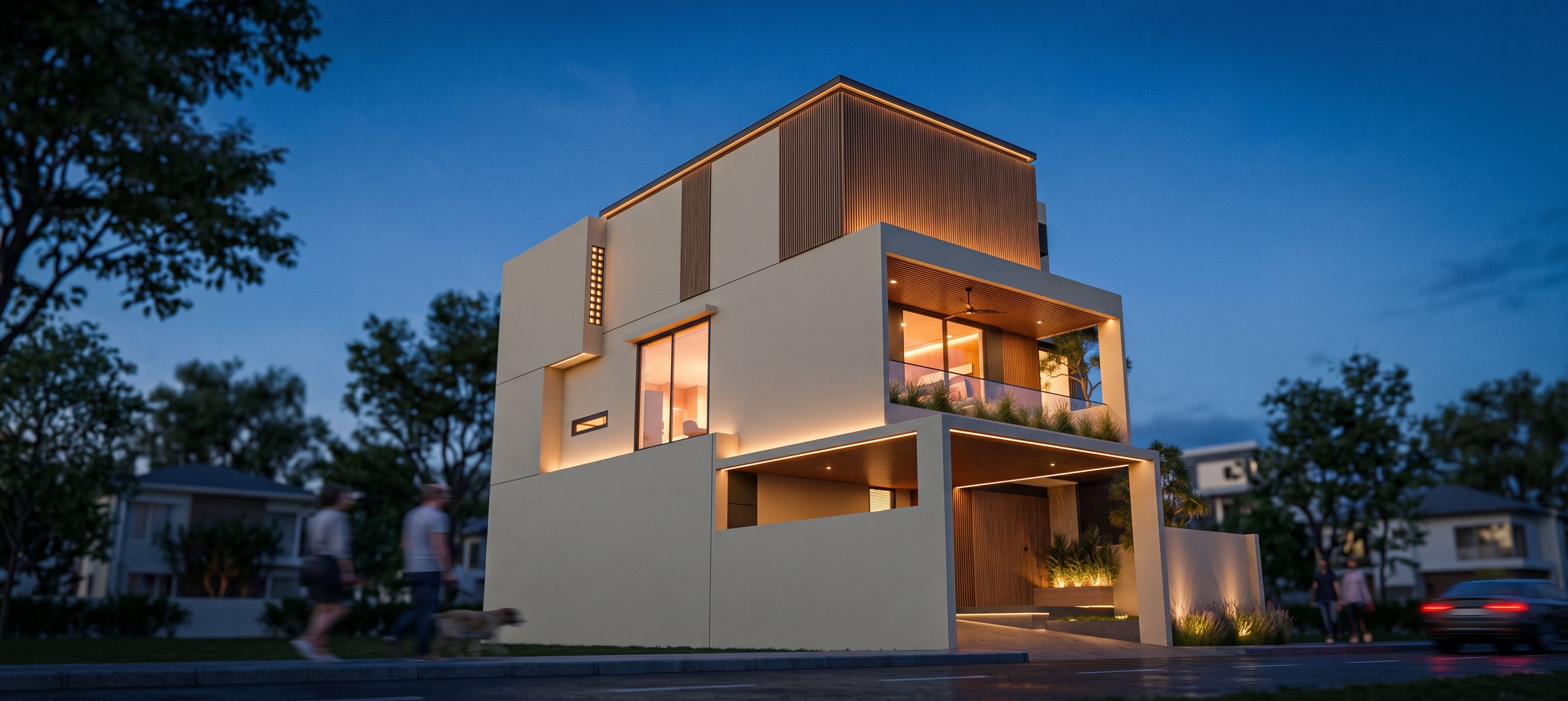 Promptmodern house in a suburban area, with warm wood accents, keeping the original colour way and shape of the building