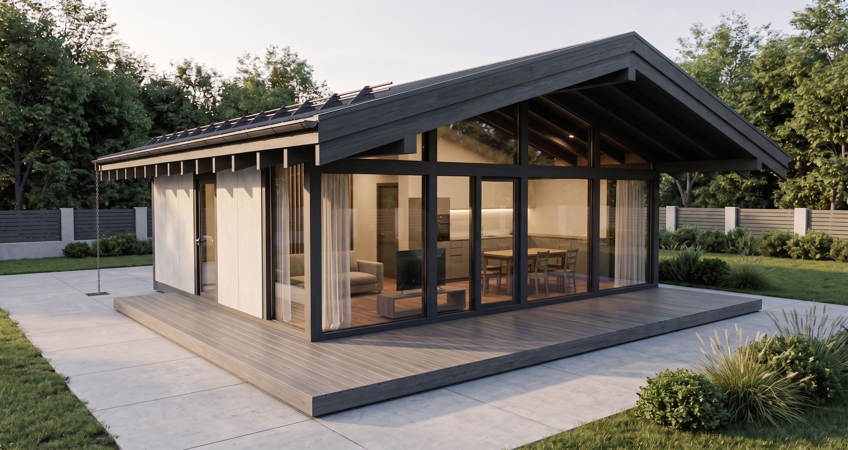 Современный одноэтажный загородный дом в стиле минимализм с элементами скандинавской и японской архитектуры, компактный объём с двускатной крышей и широкими свесами. Конструктивные балки и элементы кровли выполнены в цвете тёмный графит. Фасад с тёмным каркасом и светлыми панелями. Терраса из дерева в цвете серый графит интегрирована в уровень участка, без видимых свай и опор. Небольшая ступень аккуратно соединяет террасу с плиточным покрытием. Вокруг дома — крупноформатная бетонная плитка светло-серого цвета, аккуратные швы, минималистичный ландшафт. Участок с газоном, кустами и злаками, по периметру забор и густые деревья. Цепь водостока направлена в скрытый дренаж в плитке, без камней. Без автомобиля, чистая архитектурная сцена. Освещение — мягкий тёплый дневной свет, golden hour. Камера: трёхчетвертной боковой ракурс, акцент на вход и геометрию фасада, объектив 35mm., keep exact camera angle