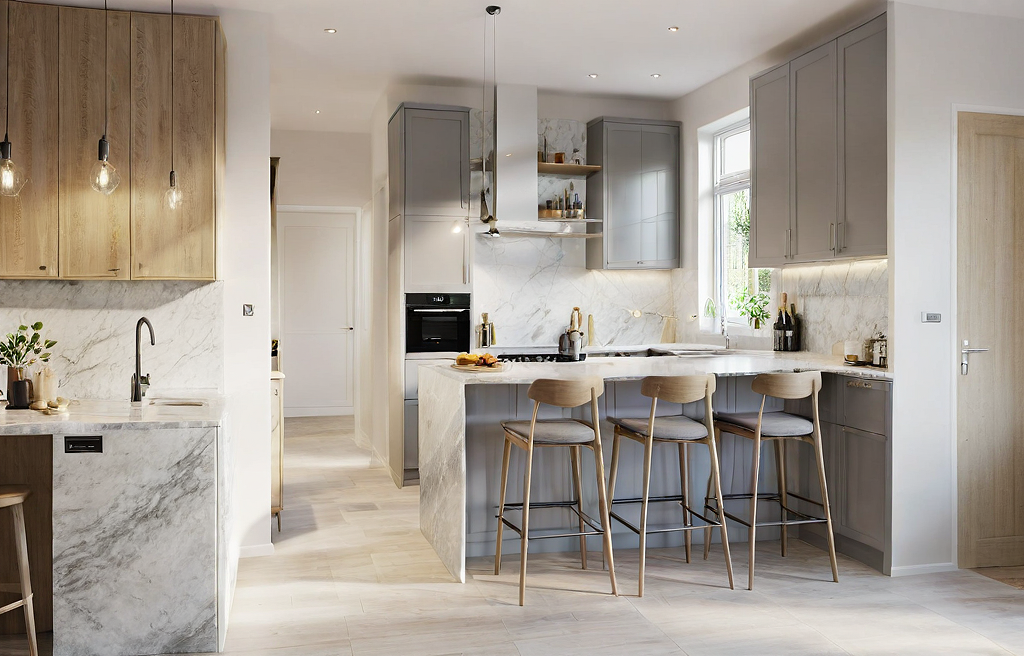 PromptAIRY AND BRIGHT SCANDINAVIAN KITCHEN. GREY MARBLE FOR TOP KITCHEN TOP AND WALL. INDIRECT LIGHT INSIDE AND UNDER HANGING CABINET