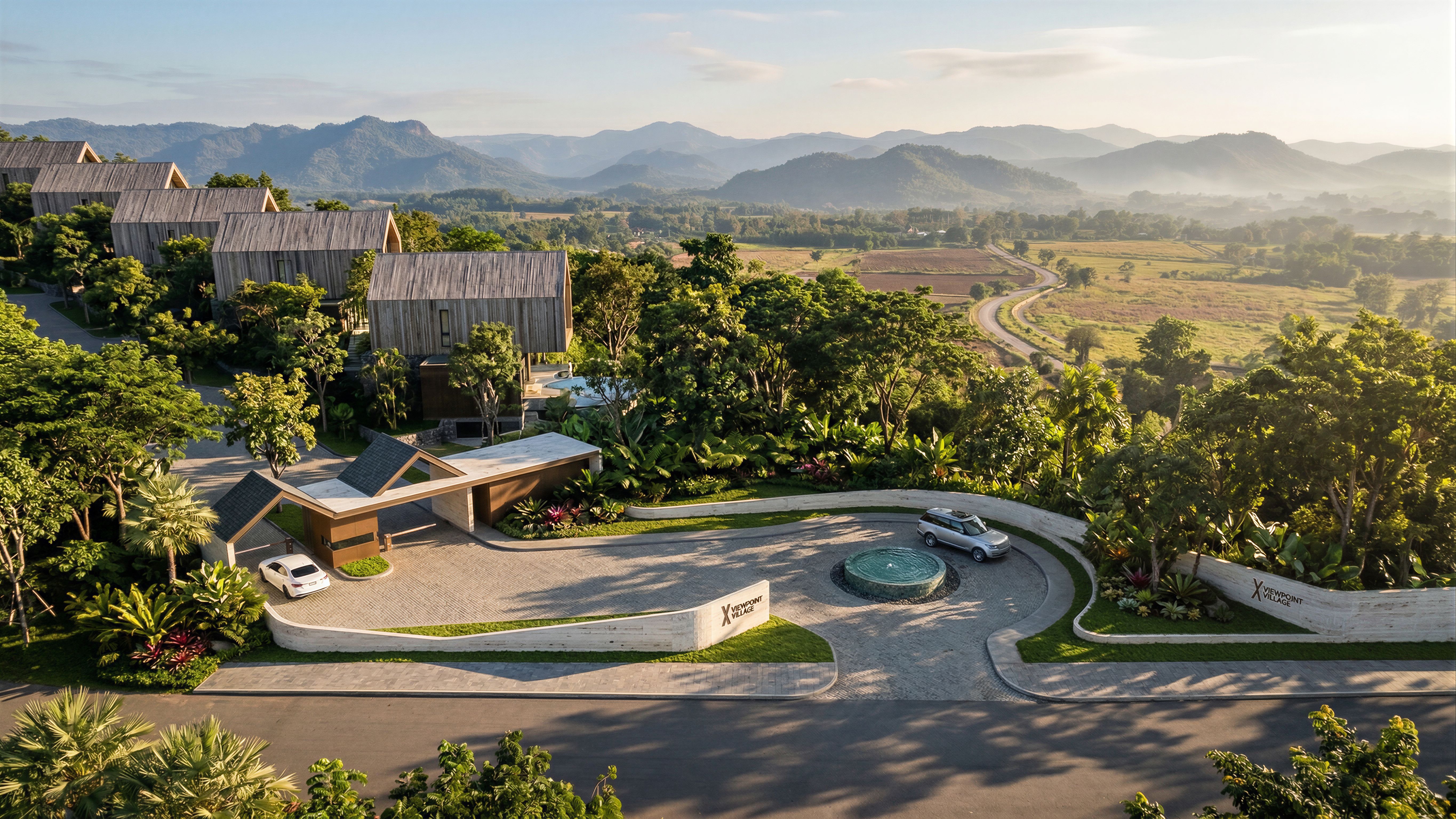 EnhancedPromptA photorealistic architectural rendering of an ultra-luxury village entrance gateway and signage located in Khao Yai, Thailand. The design follows the composition and perspective of the reference image, featuring a Luxury Minimal style. The gateway structure is defined by striking White Travertine stone walls and rich Bronze metal accents. Raking morning sunlight grazes across the wall surfaces, casting beautiful, intricate dappled shadows of trees onto the curved stone façade. The project name and logo, made of Bronze, are elegantly mounted on the entrance wall. The gateway features a prominent gable-shaped roof with dark gray asphalt shingle roofing. The surrounding environment is lush and shady, filled with large mature trees and diverse tropical flora, with leaves glistening in the morning light. A scenic view of the surrounding Khao Yai mountain ranges forms the background. High-resolution, cinematic lighting, incredibly detailed., keep exact camera angle