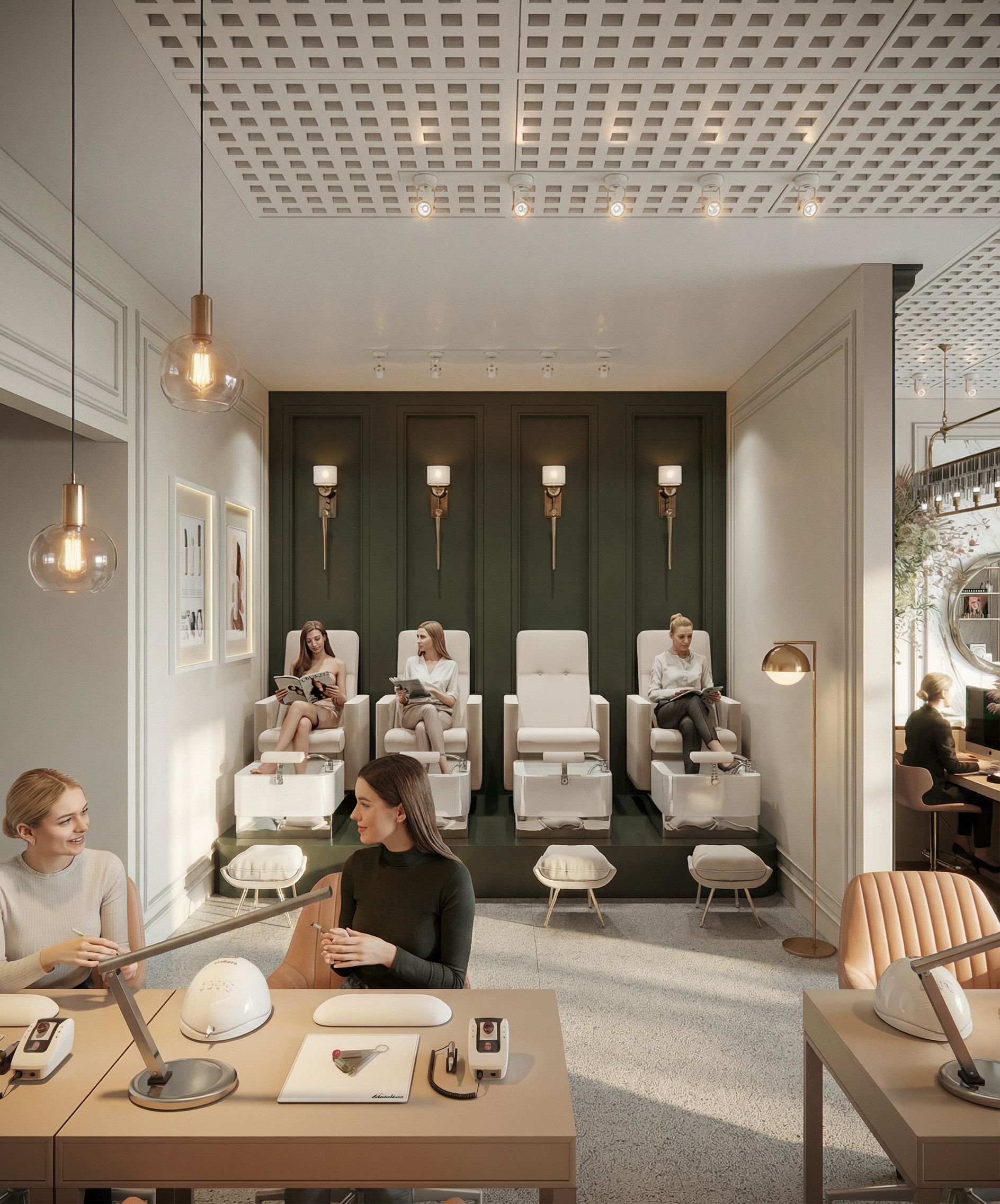 This photograph captures the interior of a modern salon, showcasing subtle architectural elements such as patterned ceilings and minimalist furnishings. The space utilizes soft, neutral tones, comfortable seating, and polished surfaces, complemented by lush greenery visible through large glass windows. Natural light floods the interior, creating gentle shadows and subtle accents. Shot from a wide angle, the composition emphasizes the open space and elegant design features, inviting viewers into a tranquil environment. The camera angle is maintained, preserving the architectural proportions and forms, as well as retaining the original materials, highlighting and depicting the textures as realistically as possible., keep exact camera angle