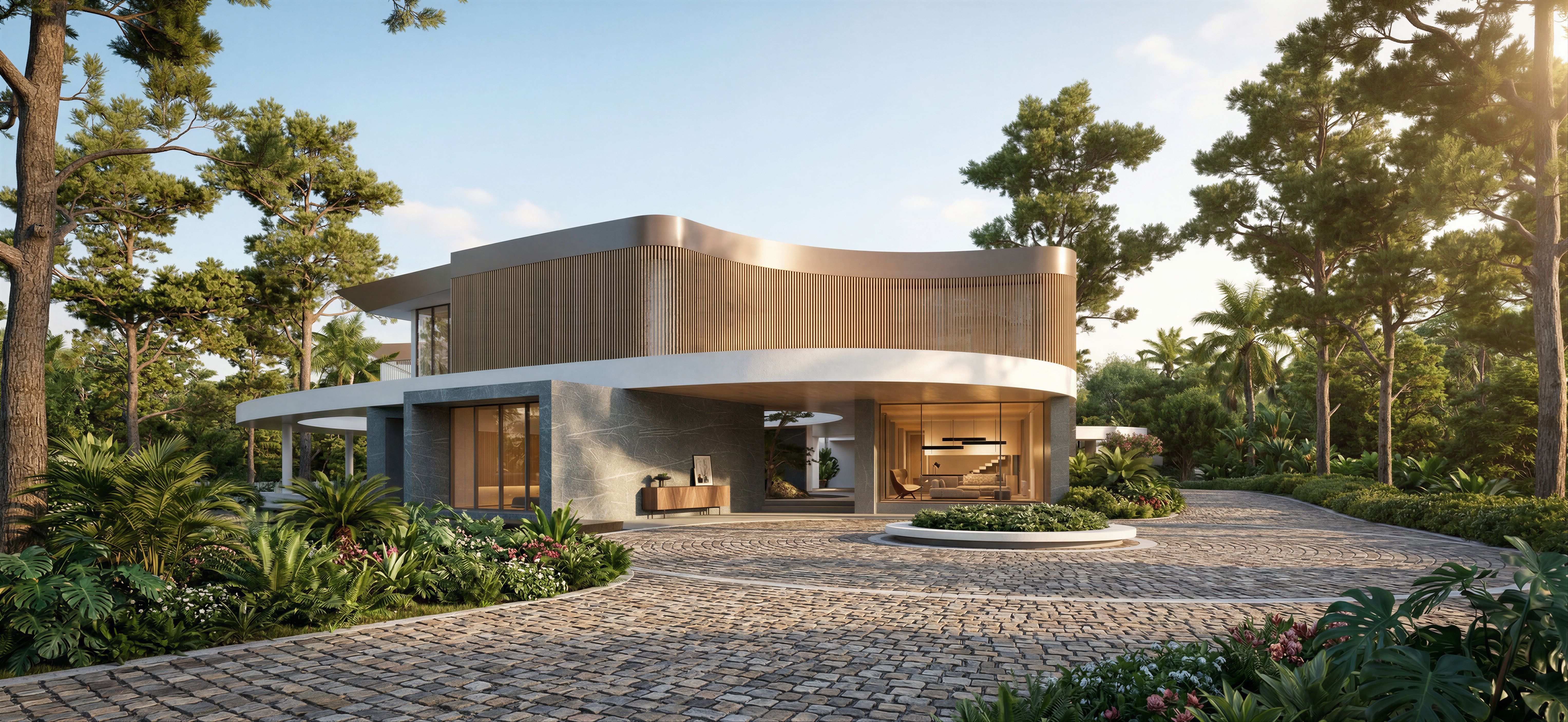 EnhancedPromptPhoto of an ultra minimal luxury villa , emphasizing sleek lines and a combination of wood and stone materials. The structure features large glass windows, vertical wooden slats, and a distinctive curved brownish gray metallic roof edge. Surrounded by tropical lush greenery, tall trees, and a cobbled stone driveway, with no cars in the image. Afternoon sunlight casts soft shadows, highlighting the architectural details. Wide-angle perspective captures both the building and its inviting entryway, enhancing its elegance and integration with the natural environment., keep exact camera angle