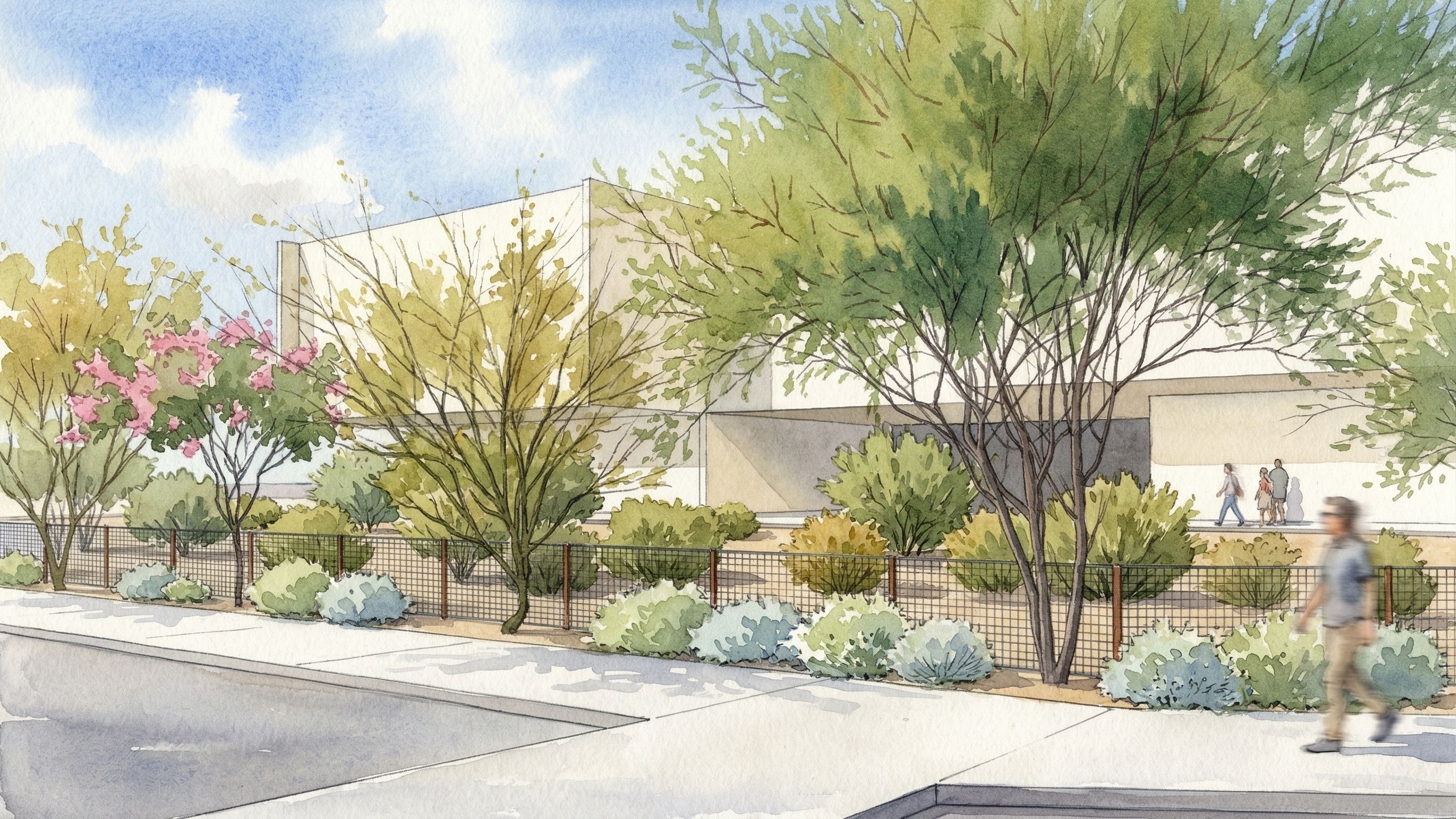 PromptInfill Landscape with Sonoran desert shrub plant palette; Space shrub planting to reflect retention basin spacing and limit palette to large shrubs such as creosote, jojoba, hopbush, etc. Only show brittlebush and bursage shrubs in front of fencing while still showing fence. The fence is the main exhibit which is a steel wire grid fence, keep exact camera angle